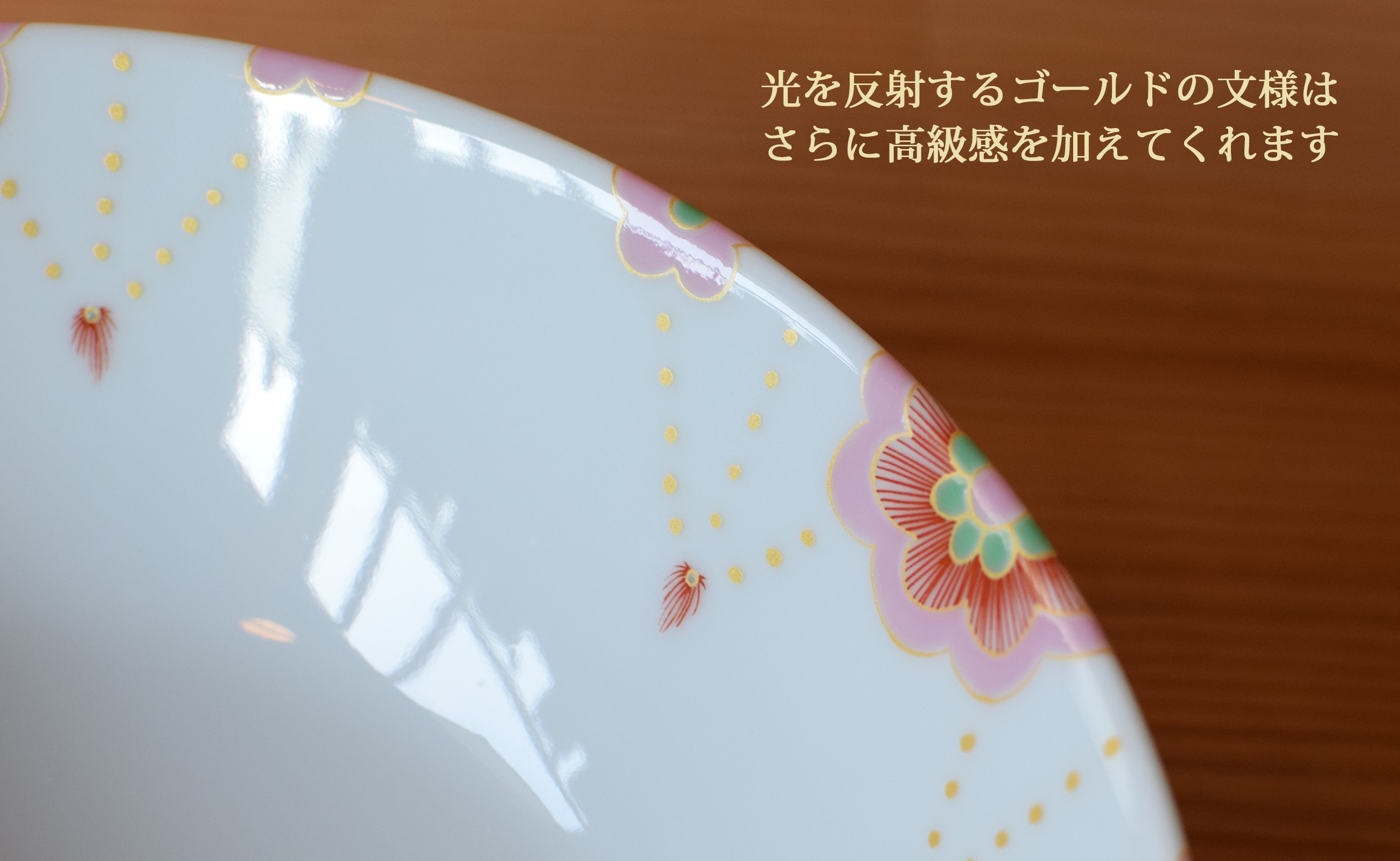 華美な文様として人気を博した金襴手(きんらんで)を現代風にデザイン。