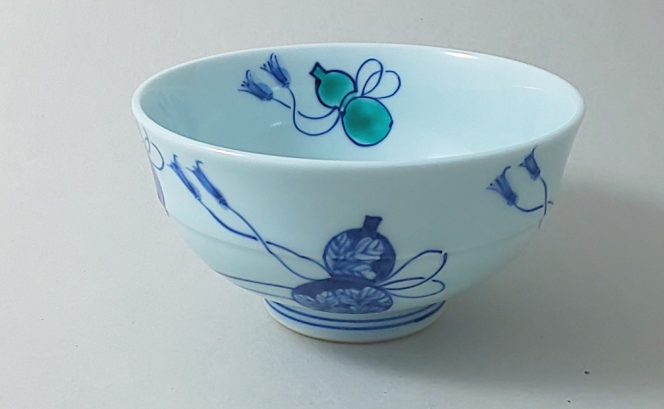 手描きの染錦で躍動感のある瓢箪の絵を描いた飯碗です。