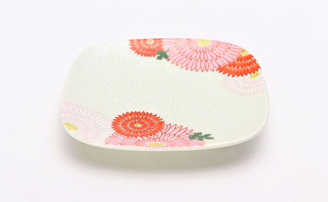 控えめな銀彩の下地に鮮やかな3色の菊のデザインが施されています。