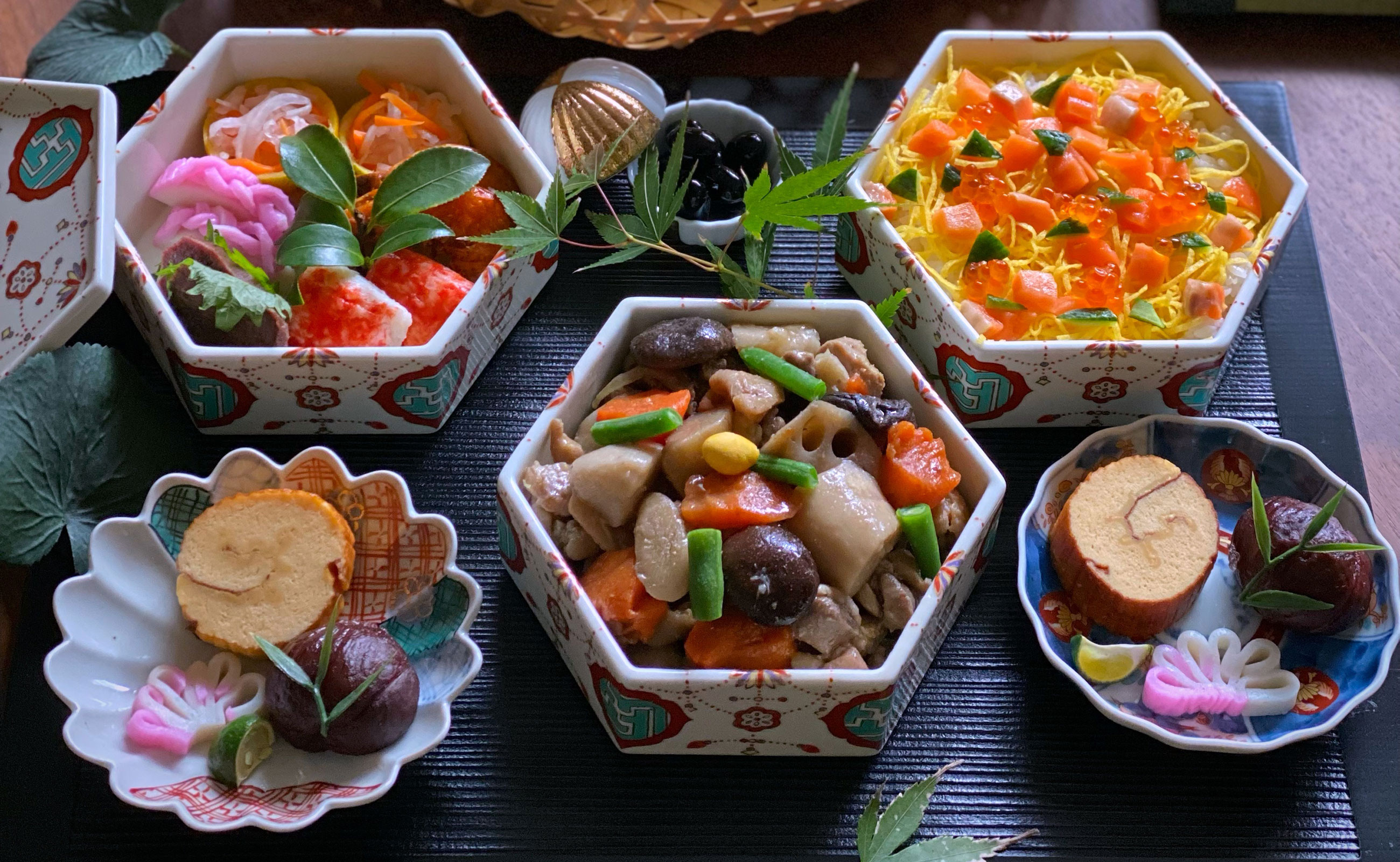 伝統的な絵柄だけど可愛い雰囲気の三段重を中心に、