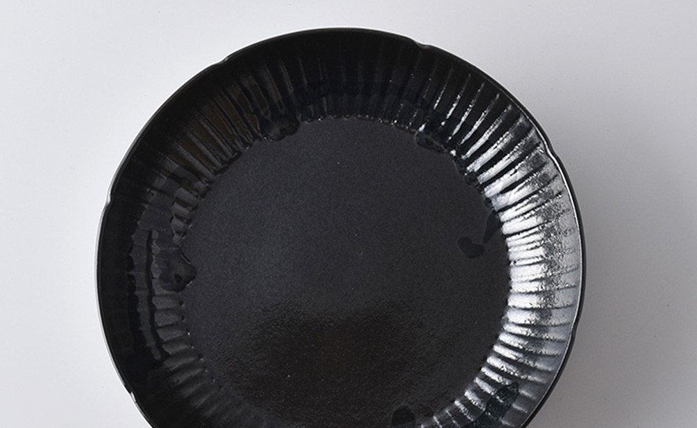 足付きの形状でとても盛り映えする器です。 有田焼 乃利陶窯 五臓六腑が喜ぶ【こくようせき】黒曜石鎬彫18cm足付パスタ皿 A25-363