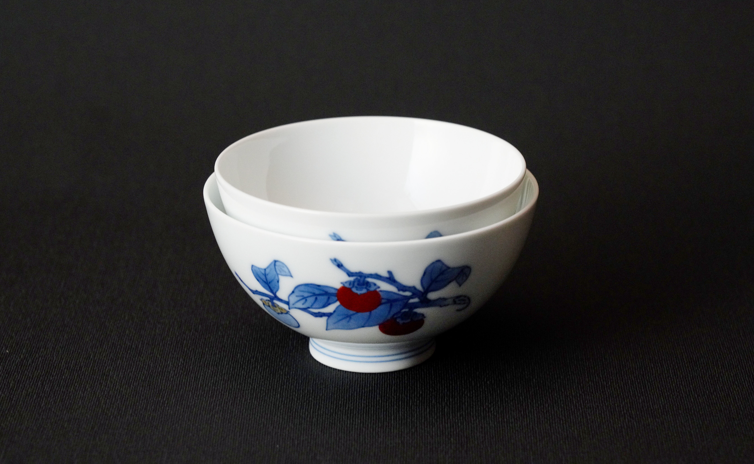 12代頃から描かれるようになった柿絵は染付で描いた枝葉に濃い赤の柿の実が美しくとても人気のある絵柄です。小ぶりでまっすぐに立った形状はお茶だけでなくお酒を飲む時の器としてもお使いいただけます。 提供:柿右衛門窯