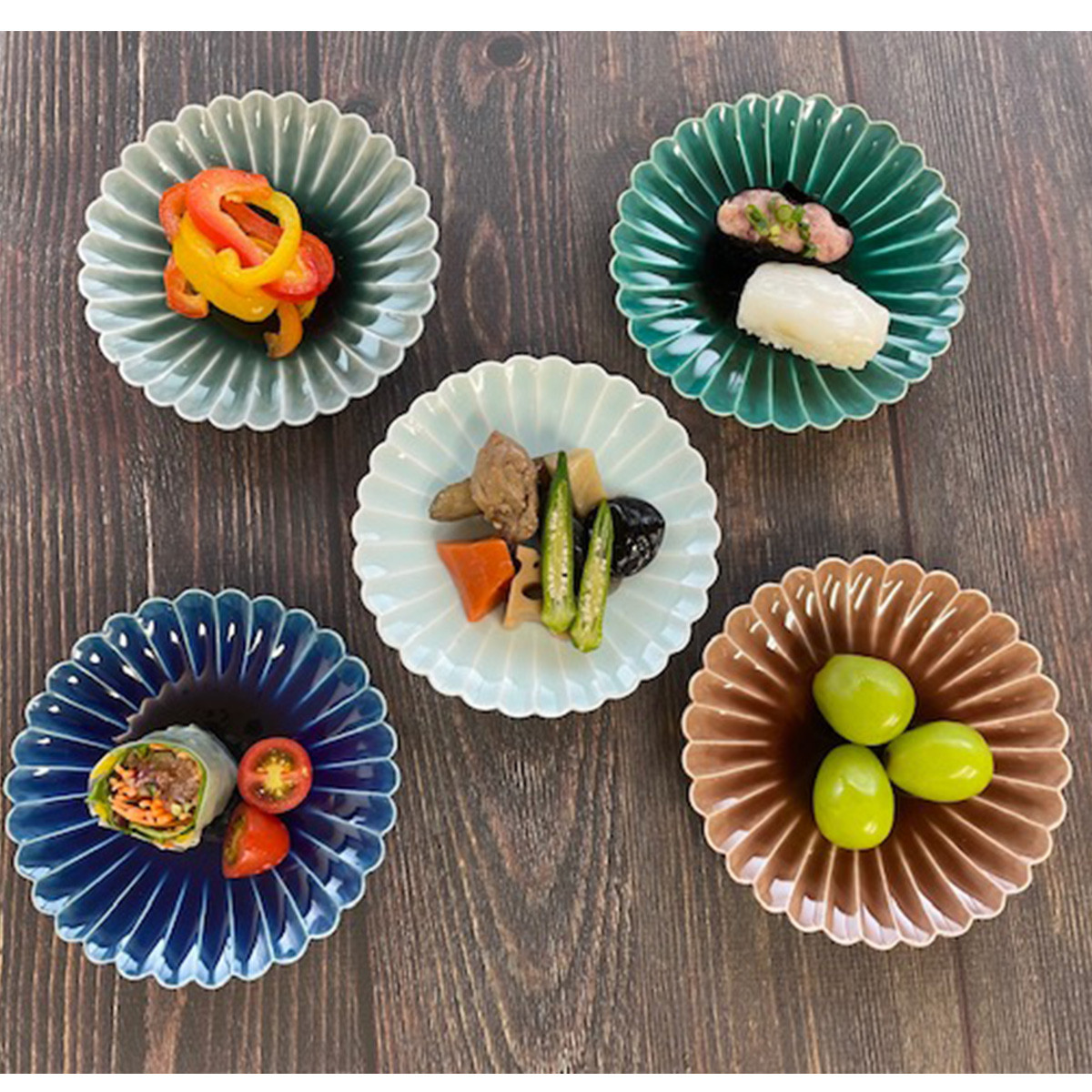 5色がありおめでたい菊の花びらの形です。日々の暮らしを華やかにしてくれるプレートです。 取皿や銘々皿として毎日の食卓にお使いいただけます。