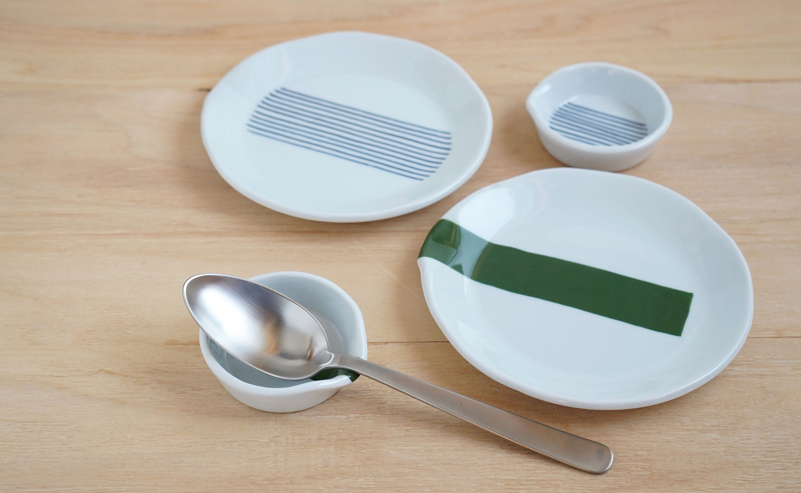 白地にラインのさわやかな大小共に凹みがあり箸置きになり清潔に使用できます。