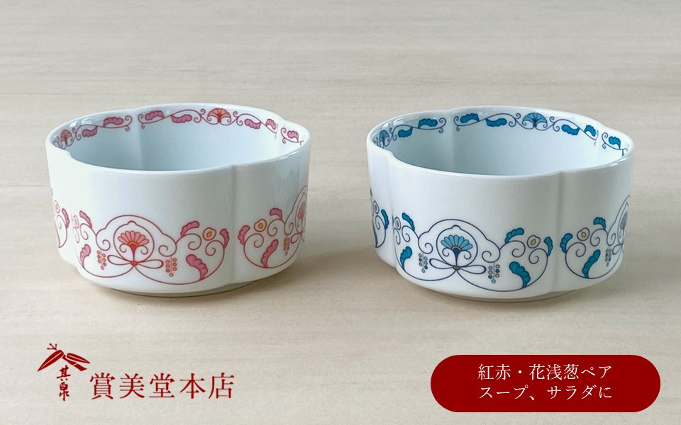 サラダ・スープにちょうど良いボウル 有田焼 其泉 ゆいからくさ 四つ葉形 ボウル 花浅葱 紅赤 ペア【賞美堂本店】器 うつわ 食器 皿 鉢 ボウル ペア 2枚 赤 青 贈答 ギフト 電子レンジ対応 食洗機対応 A45-307