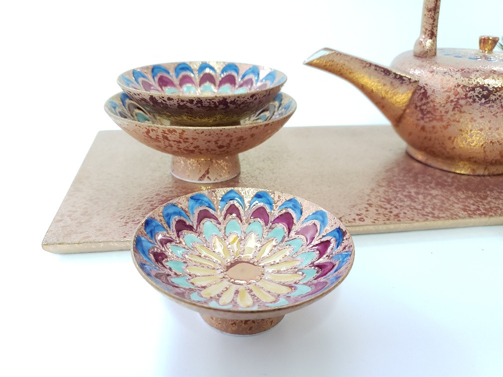 ピンクゴールドの輝きと色ラスターの鮮やかな菊の色使い。