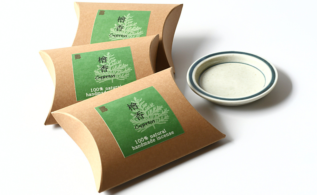 有田町の檜の葉と山水を使って、燃焼材、合成香料などの添加物は一切使用せず、天然原料100%で作られたハンドメイドのお香です。