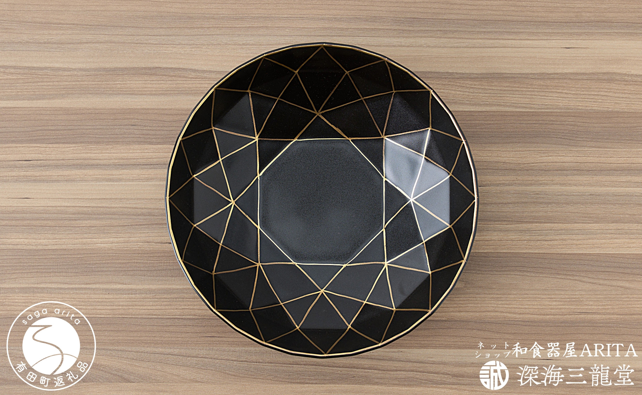 ダイヤカットの形状を引き立てる手描きの金ラインは高級感があり、ほどよい艶のある黒とともに料理を引き立てます。