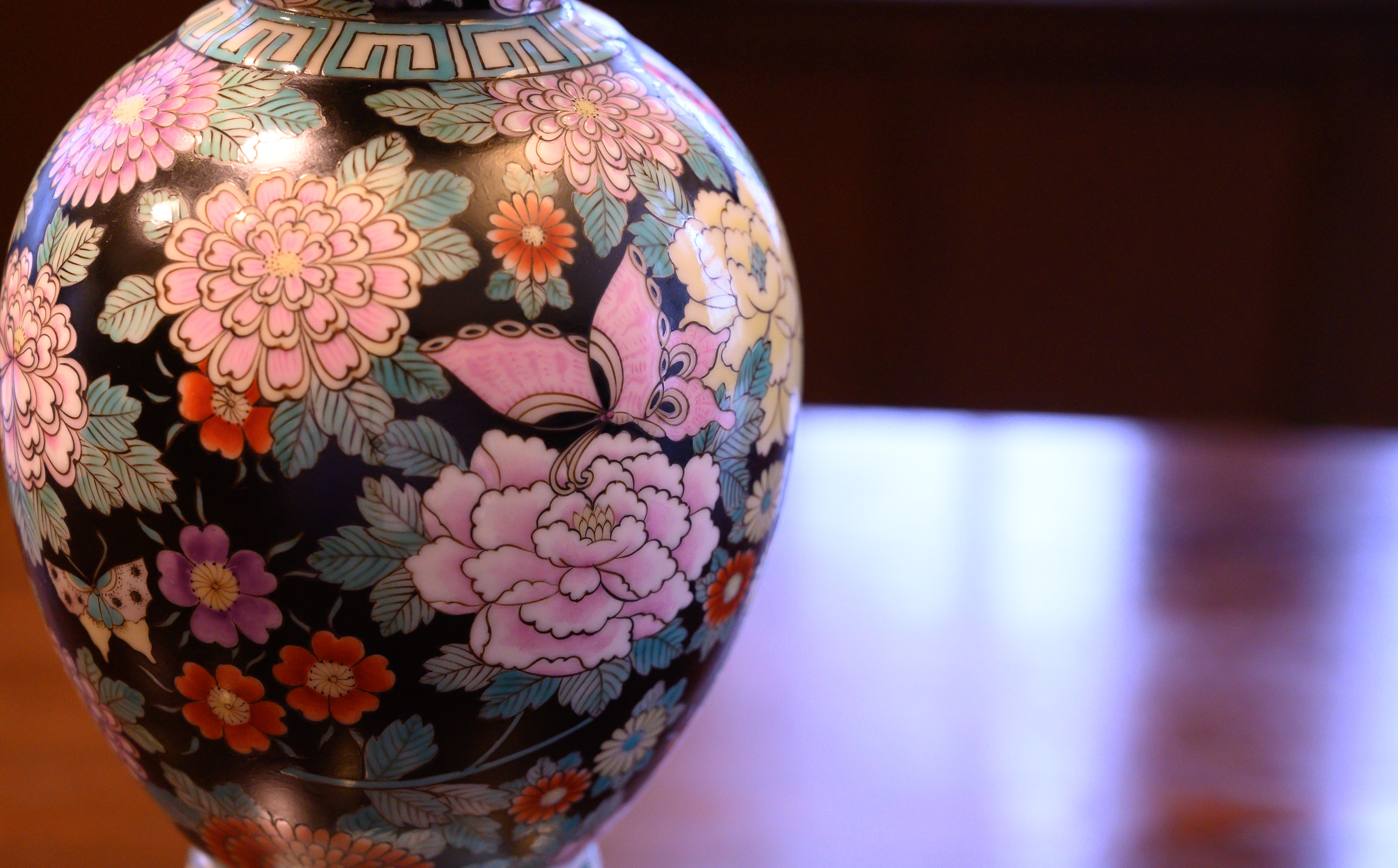 明治期古陶磁の大蓋物に使用されていた図柄を飾り壷に復刻。