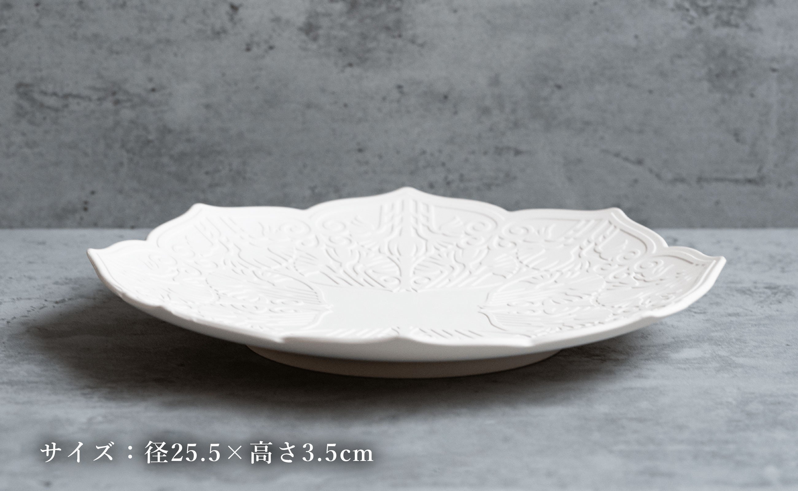 お皿の全面に切り紙のレリーフが施されている上品なプレートです。