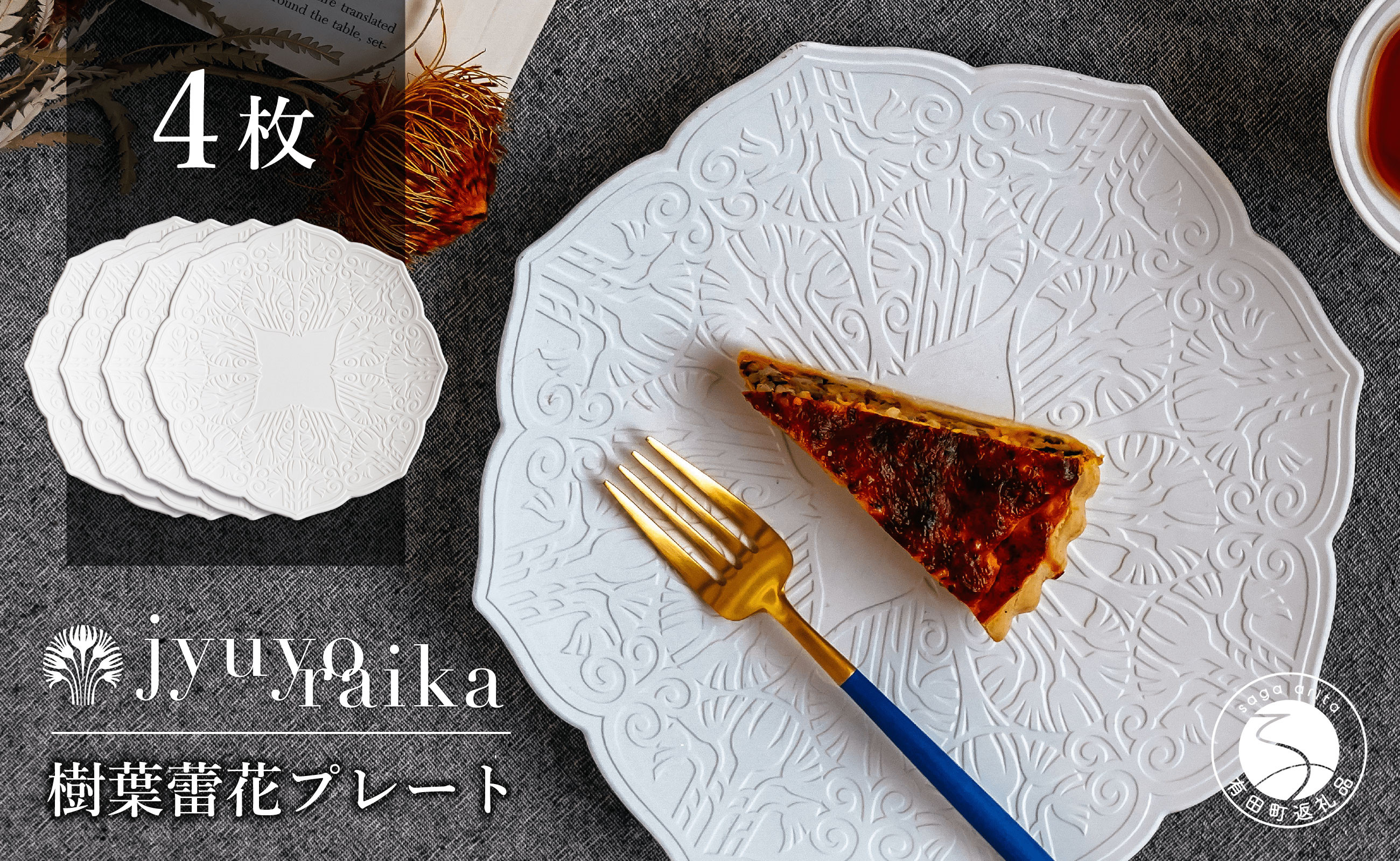 お皿の全面に切り紙のレリーフが施されている上品なプレートの4枚セットです。