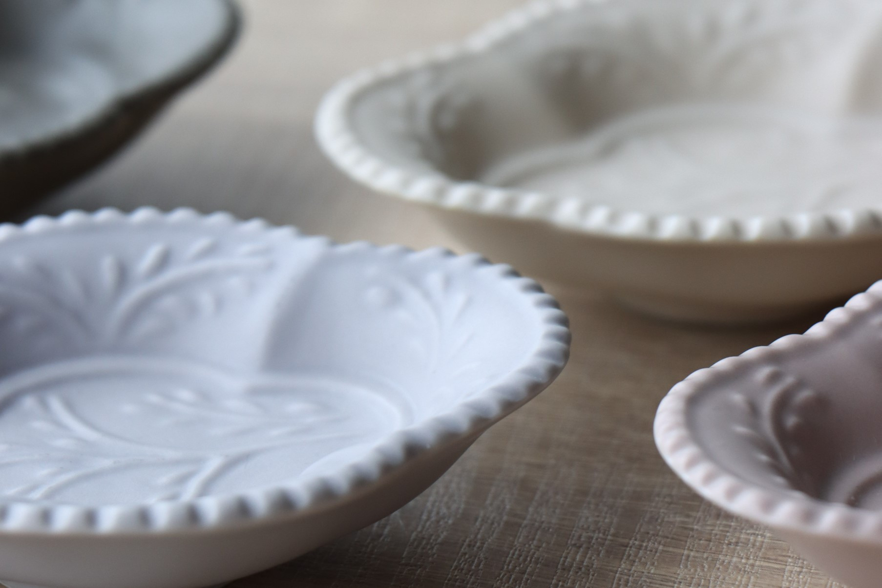 彫りの入ったデザインに、ペールカラーの淡い色合いが大人かわいい雰囲気を演出してくれます。