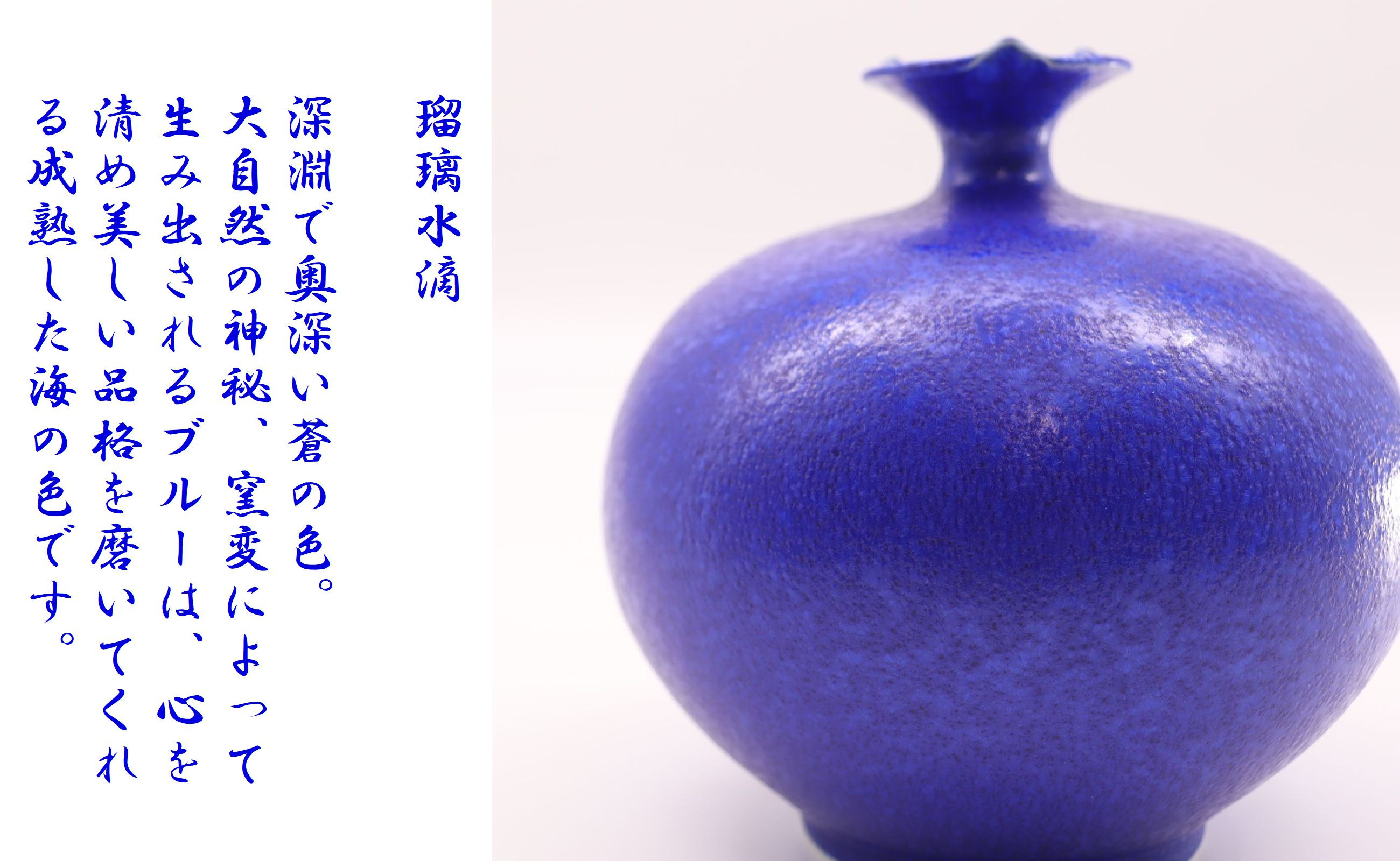 至宝の結晶釉「瑠璃水滴」とは、オリジナルの釉薬を窯変技法によって化学変化させ生み出される奥深い青を表します。