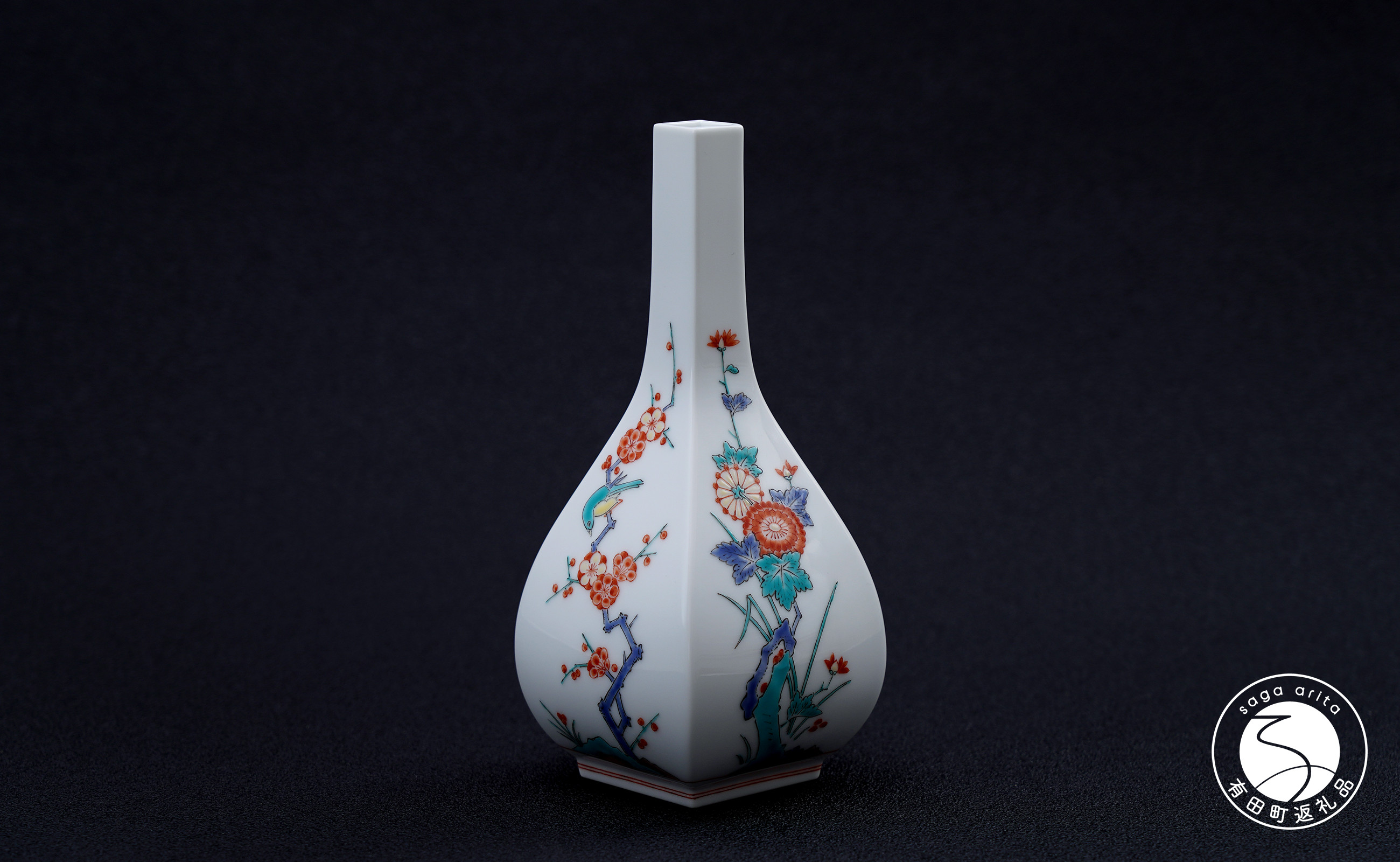 豪華で品格が備わった面取の鶴首形一輪生 柿右衛門窯作 一輪生 角形 菊梅鳥文 A350-21
