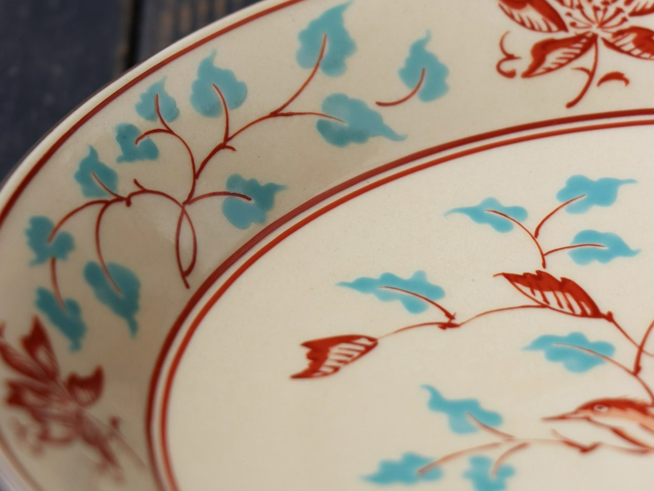 黄み帯びた地肌に、赤と水色で彩られた花鳥の絵柄がどこか懐かしさのあるアンティークのような器です。