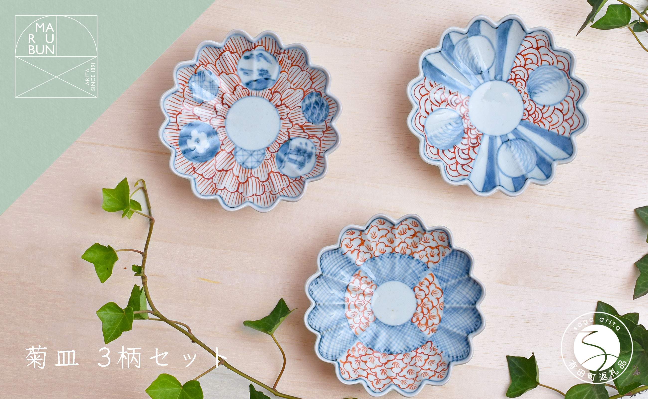 赤絵の魅力を今に伝える菊形小皿 有田焼 文青 菊形小皿 3枚セット【まるぶんオリジナル】食器 器 うつわ 磁器 陶磁器 和食器 取皿 小皿 豆皿 菊 染付 赤絵 初期伊万里 お正月 ハレの日 赤 青 電子レンジ対応 A35-339
