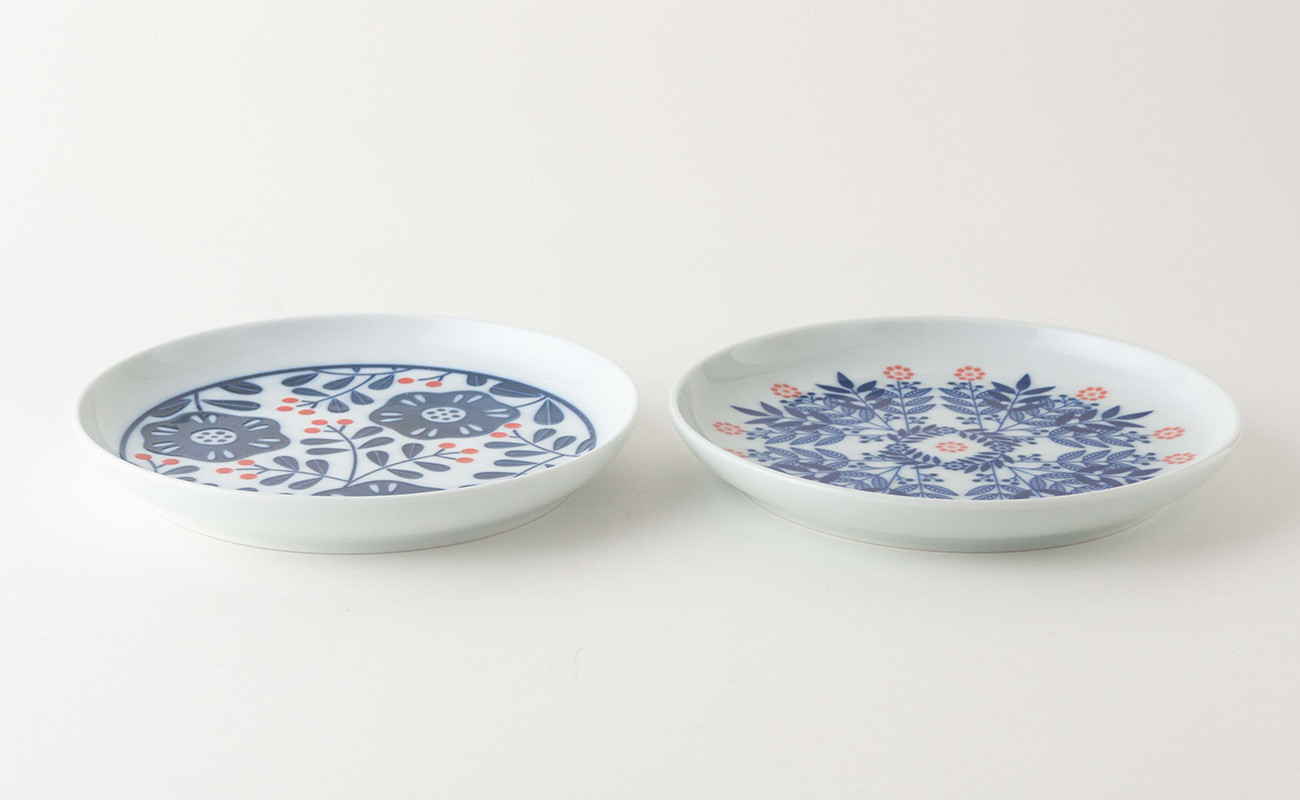 大輪の花と枝に色づく小さい赤い実がちりばめられた模様の「赤の実」と生い茂る草々に小さく愛らしい花が咲いている様子がデザインされた「リーフ」。 パン皿、サラダ皿、ケーキ皿など用途はさまざま。 カップとお菓子をのせてソーサーのように楽しんでみるのも◎。 スタッキングも良好で普段使いに重宝します。 窯元:KIHARA 提供:株式会社 キハラ