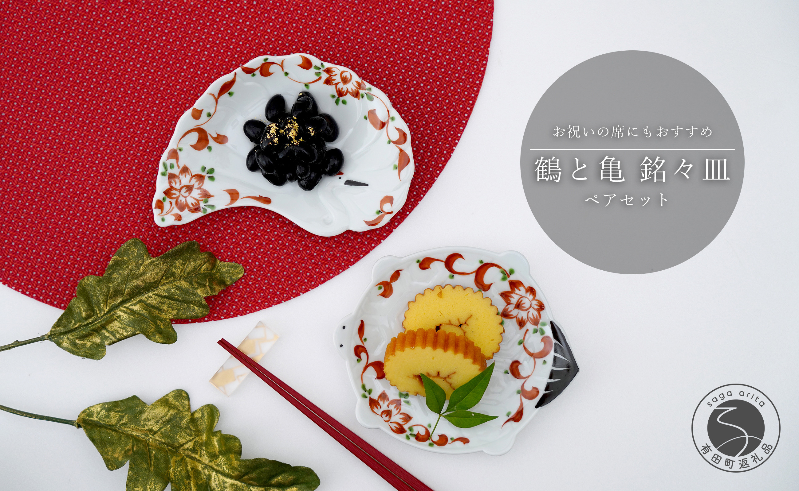 縁起物「鶴と亀」お祝いの席から日常の食卓にも 有田焼 銘々皿 鶴と亀 ペアセット 大慶 食器 うつわ 器 お正月 ハレの日 お祝い 小皿 A20-515