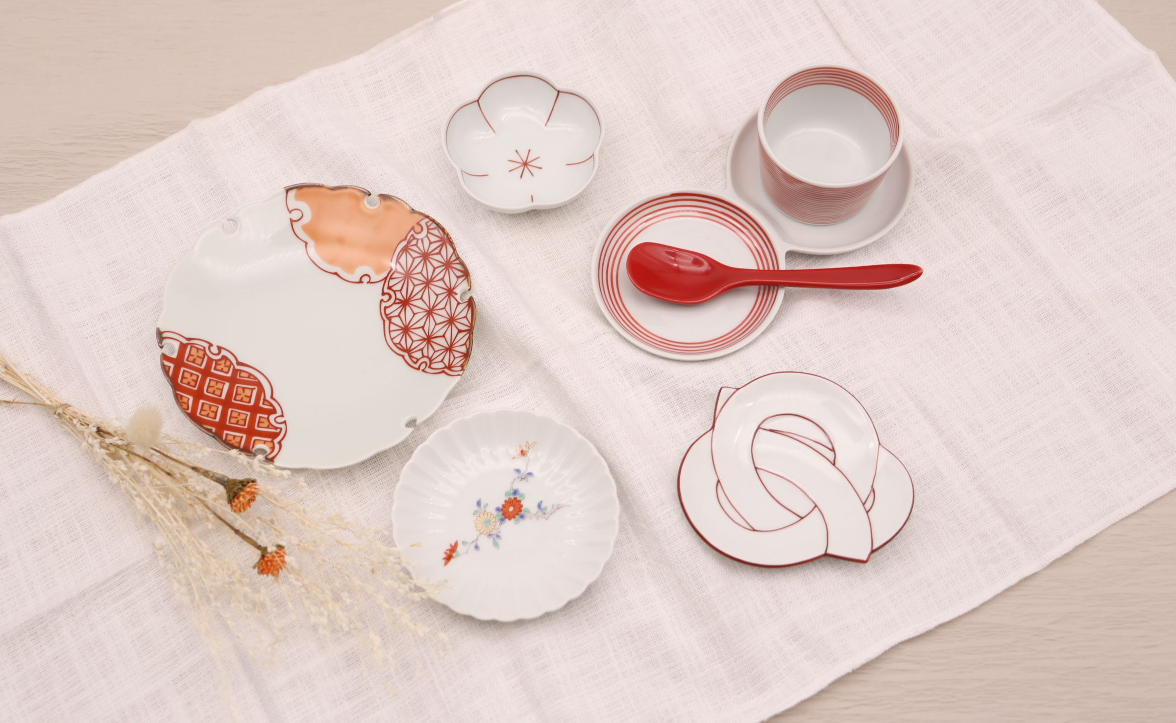 [ 数 量 限 定 ] 人気のアイテム 7点 セット / 赤絵 深海三龍堂 有田焼 和食器 結び 雪輪 菊 梅 手描き 縁起物 ハレの日 おもてなし 詰め合わせ A40-296