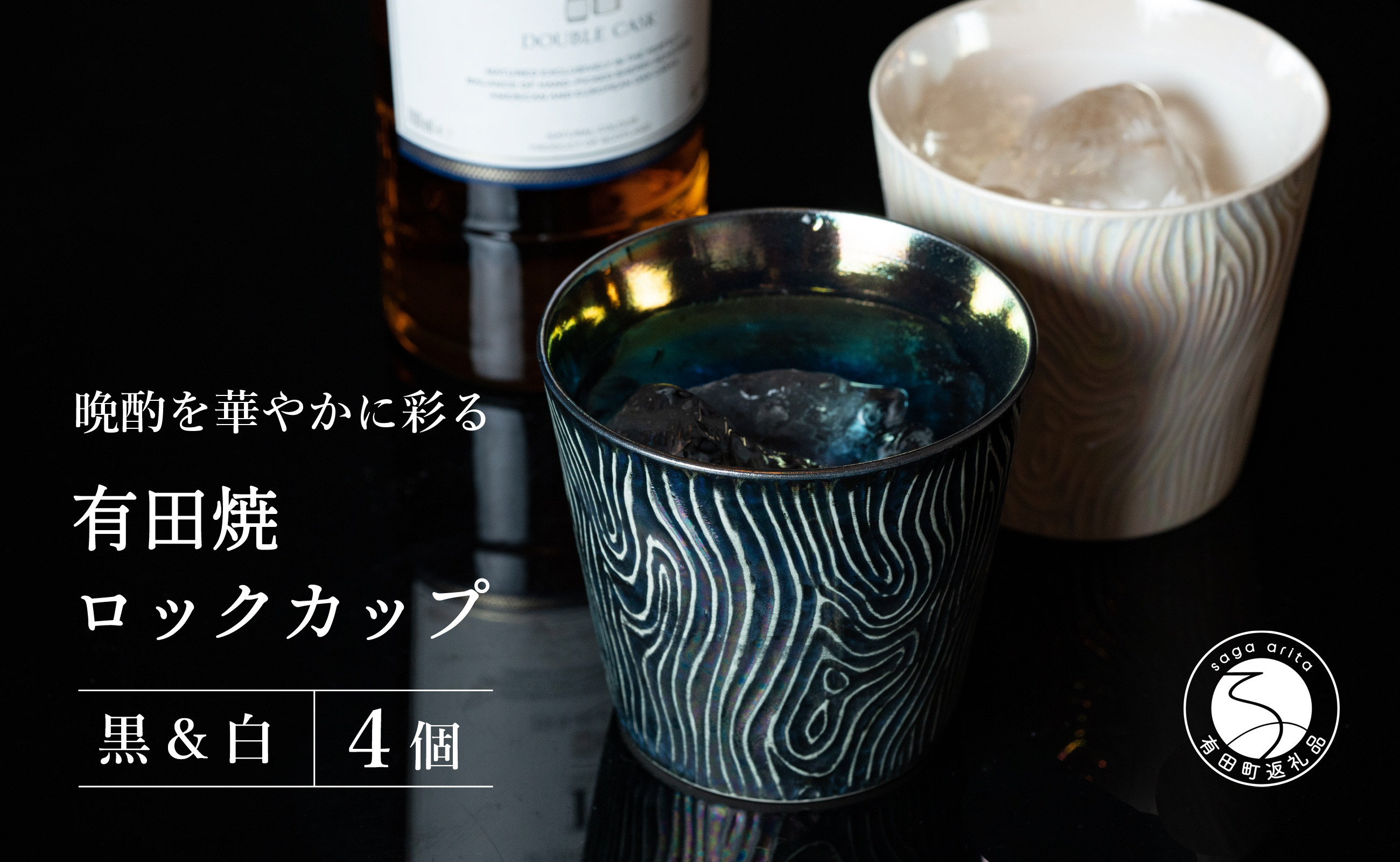 まるで金属のような光沢の有田焼。贈答にも◎ 【晩酌を華やかに】メタリックな有田焼 ロックカップ(木目) 黒 & 白 計4個セット 女性にも人気 【喜鶴製陶】軽量 ギフト ペアセット 食器 有田焼 ロックグラス ビアカップ タンブラー A35-287