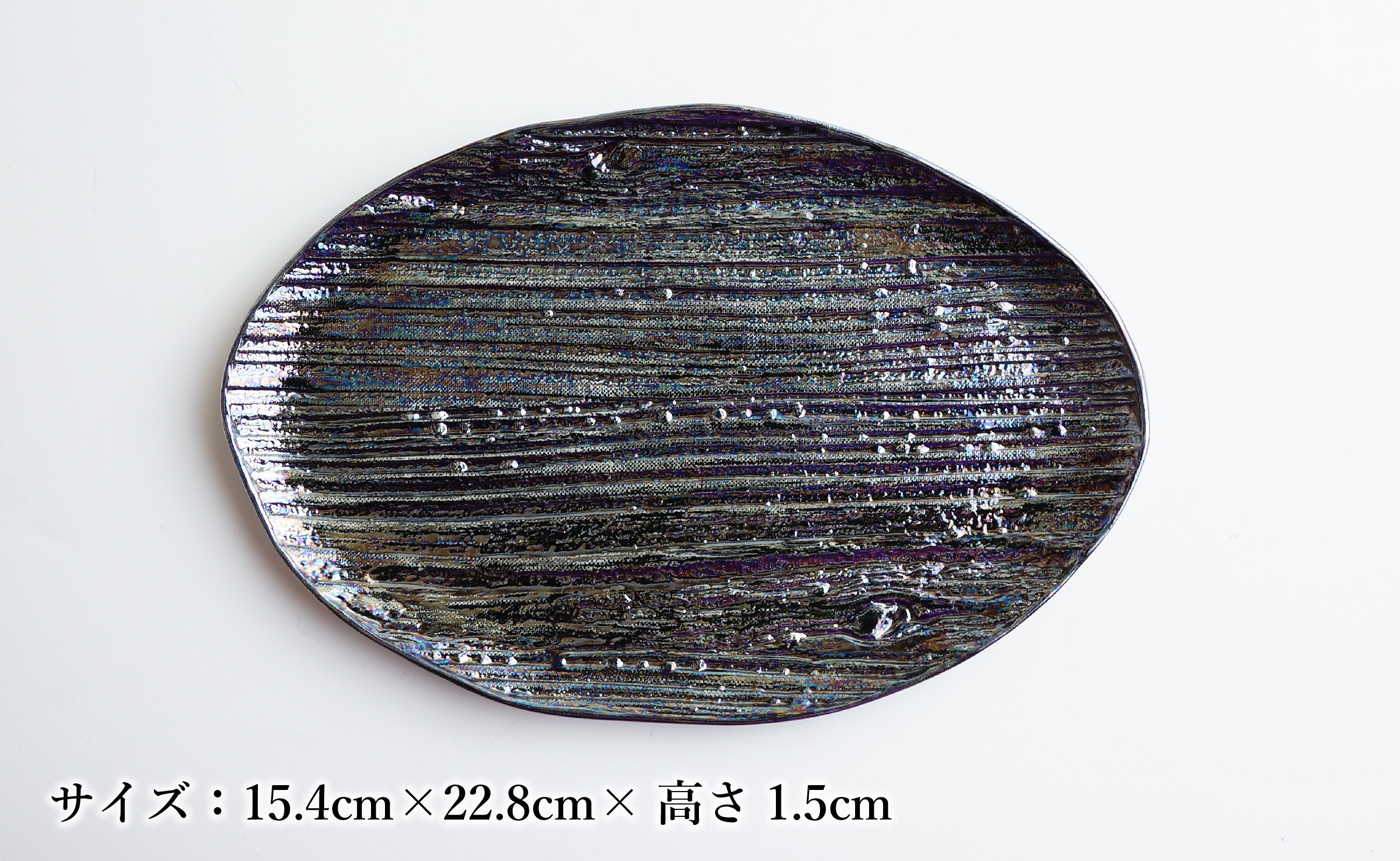 本物のようなゴツゴツとした木目と、手づくりの風合いが出るような楕円の形、光が反射してうつくしいラスター釉薬で、食卓をパッと華やかに彩ってくれます。