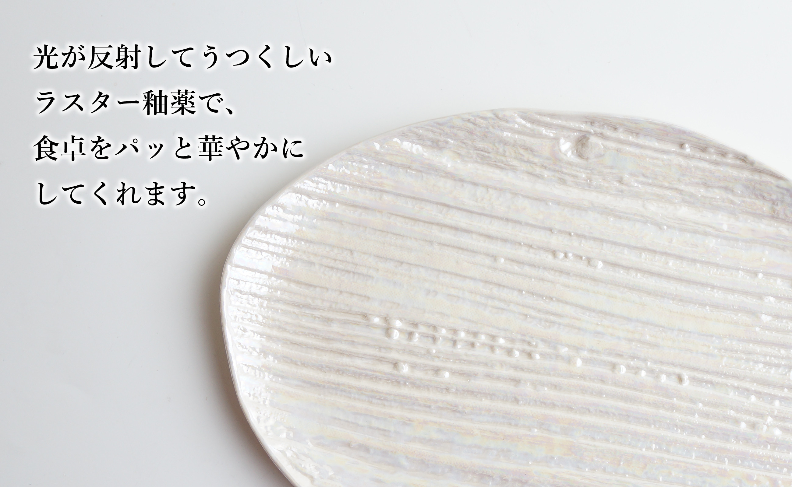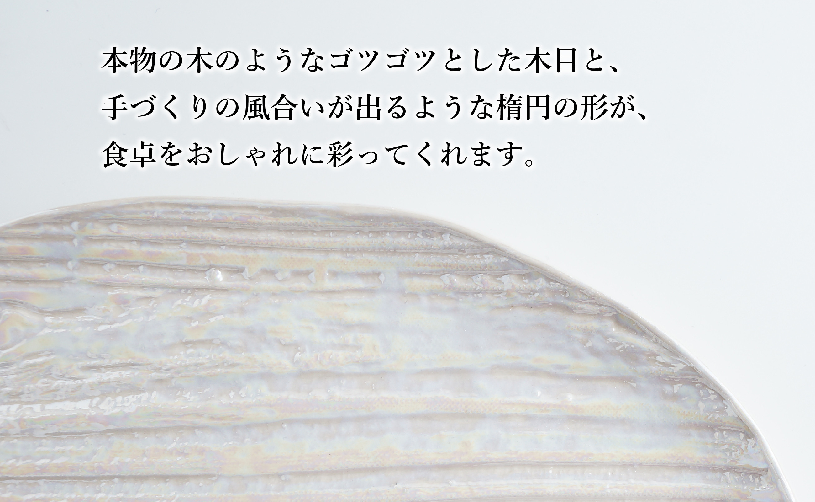 本物のようなゴツゴツとした木目と、手づくりの風合いが出るような楕円の形、光が反射してうつくしいラスター釉薬で、食卓をパッと華やかに彩ってくれます。
