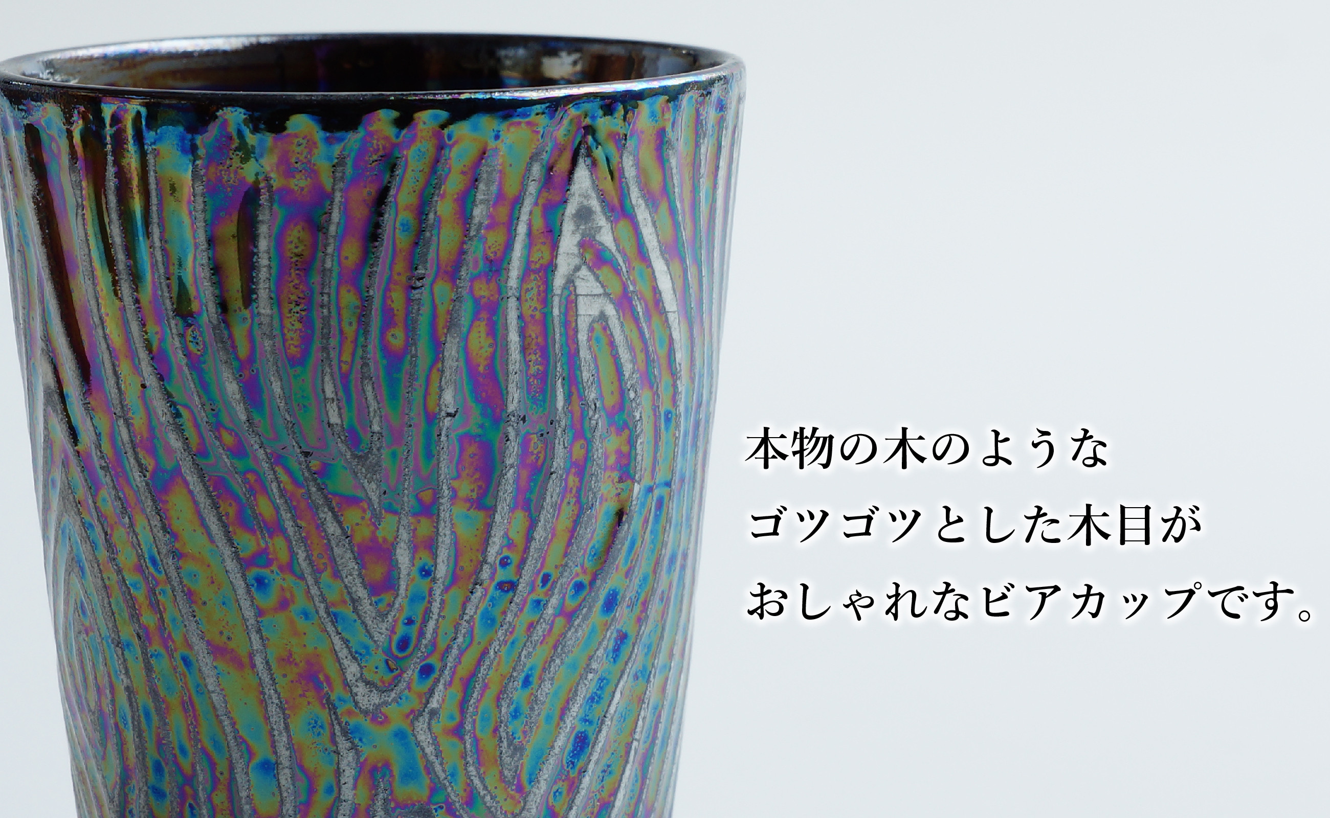 本物の木のようなゴツゴツとした木目がおしゃれなビアカップです。