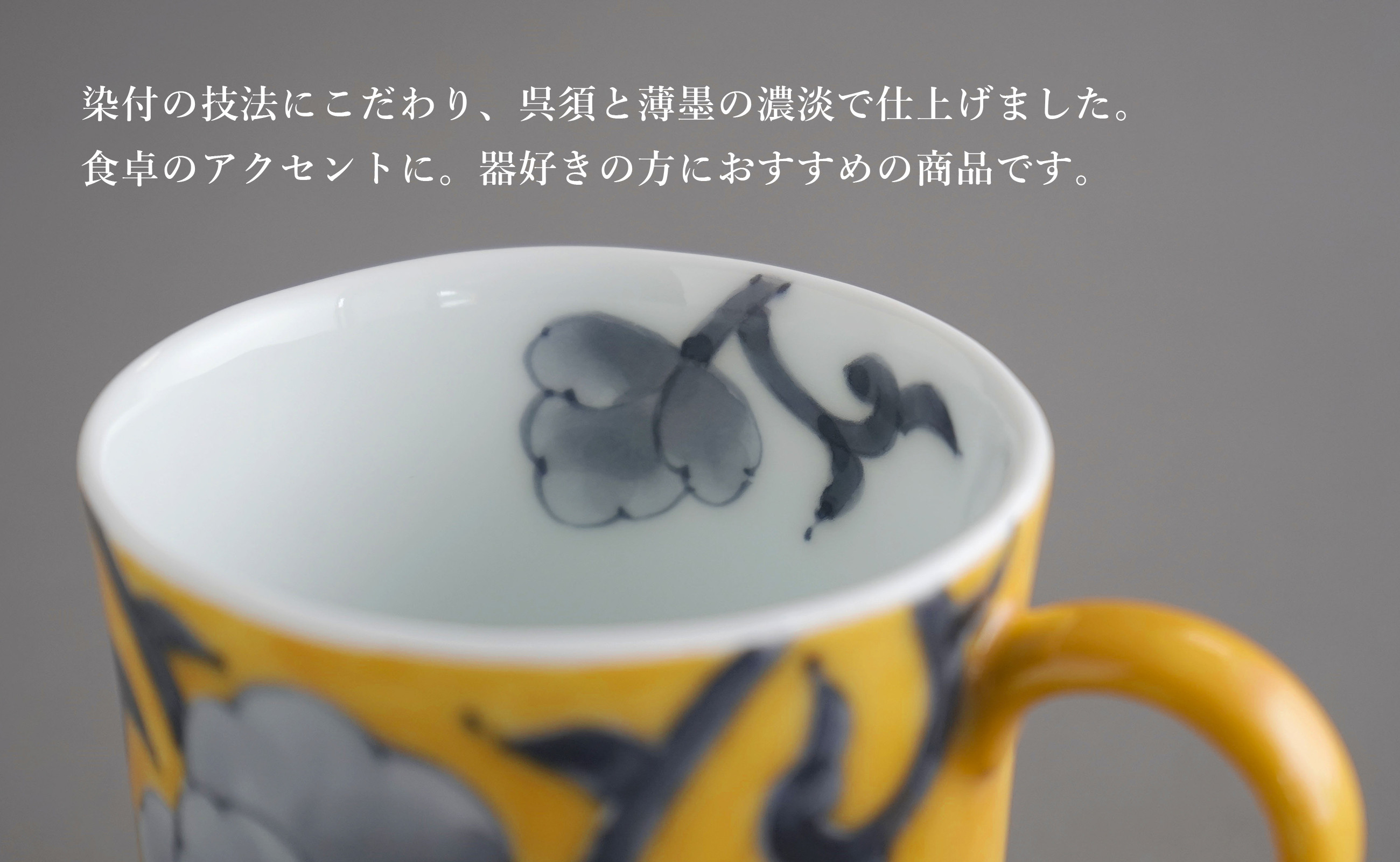 朝の忙しいときに使っても安心!厚手のマグカップ 有田焼 食洗機対応 牡丹唐草マグカップ 呉須・黄 ペアセット【泰山】食器 器 うつわ コーヒーカップ A60-83