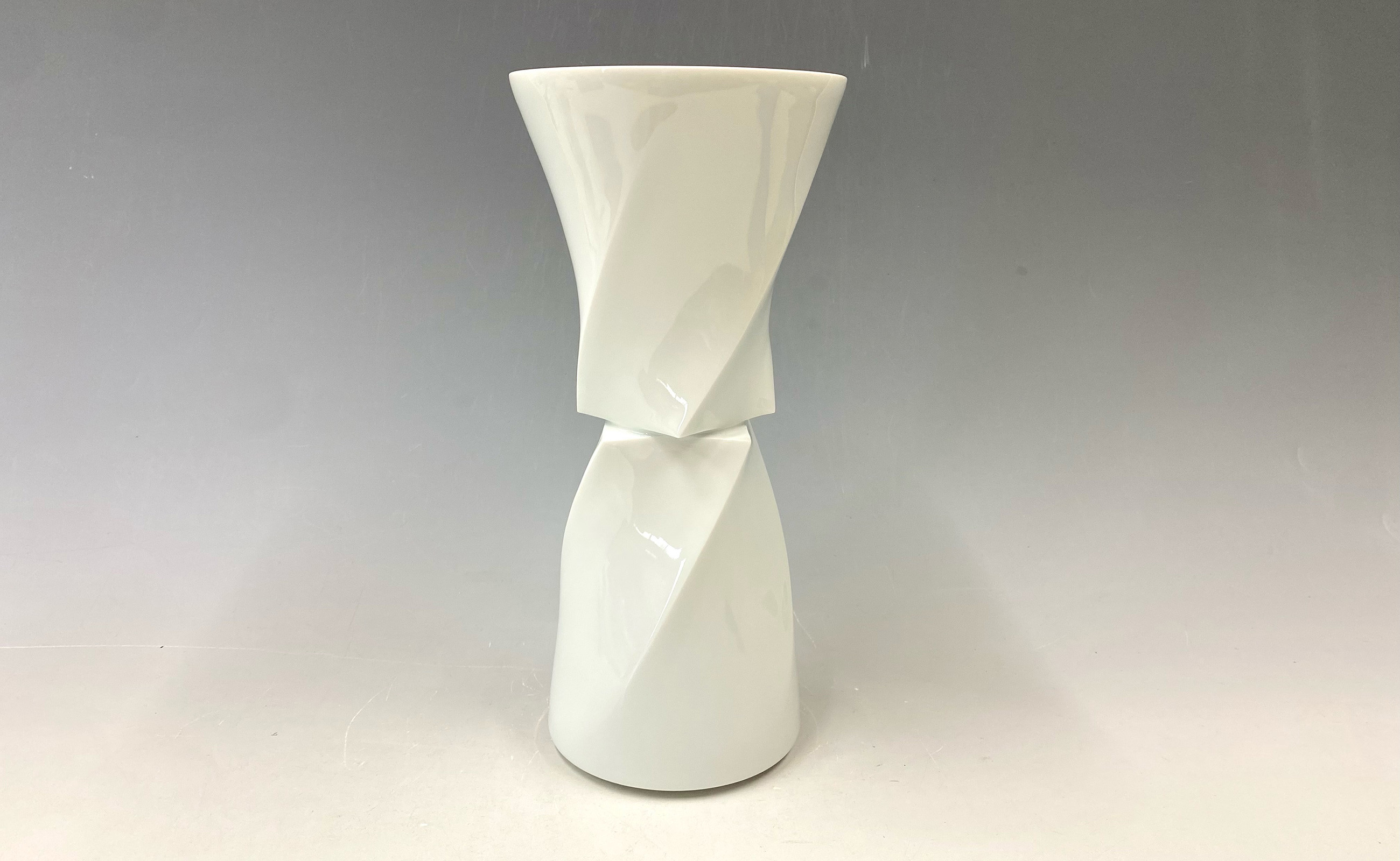 特上の陶土を使い、ろくろで細くて厚みのある円柱の柱を作り、乾燥後削って、面を作りました。伝統と現代の融合を感じられる白磁花器です。アートとしても楽しんでいただける作品です。