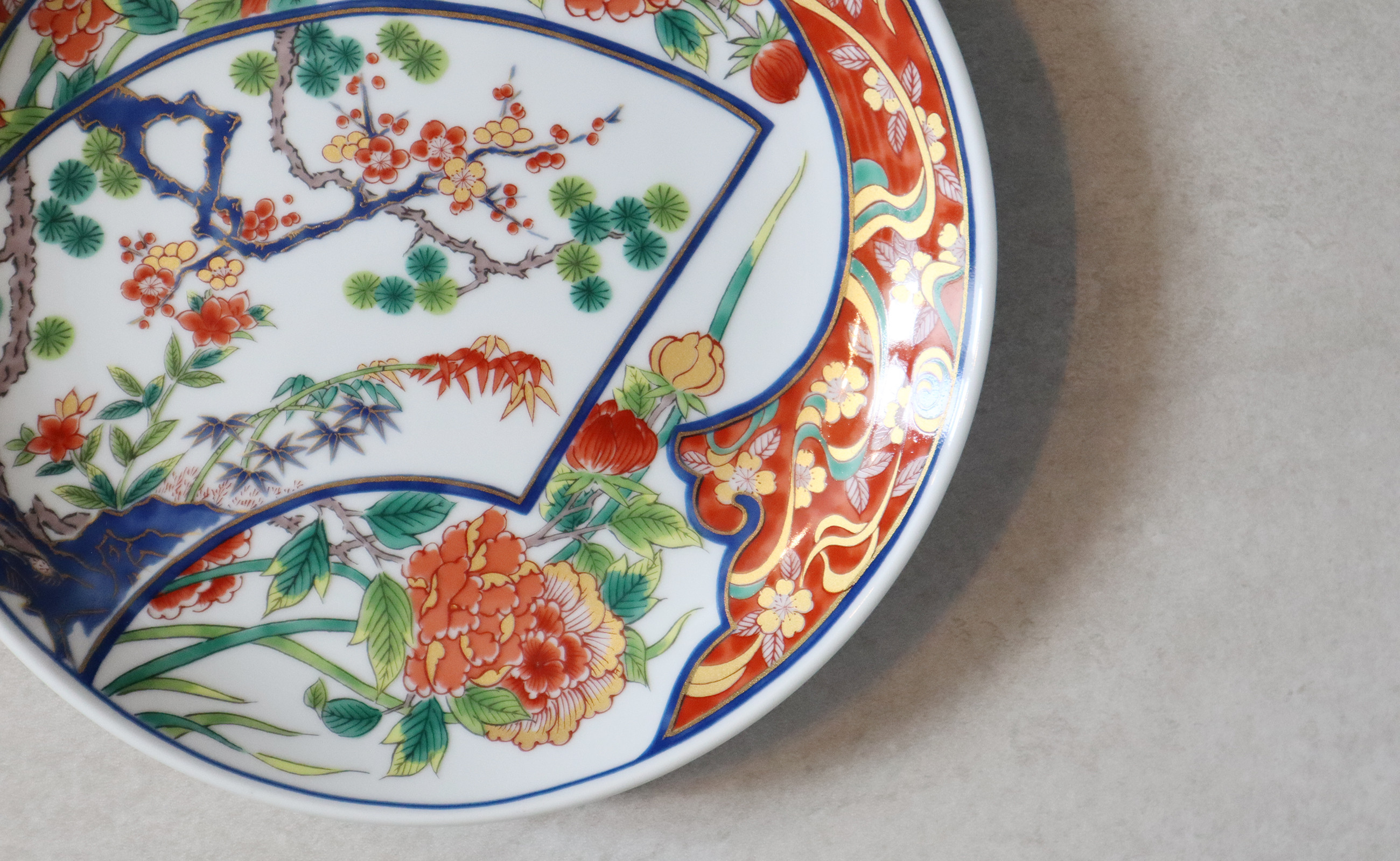 華やかなお正月のシーンにもぴったり! 有田焼 扇割松竹梅 21cm プレート 2枚セット【まるふく】お正月 はれの日のうつわ おしゃれ 和食器 ワンプレート 盛皿 A55-119