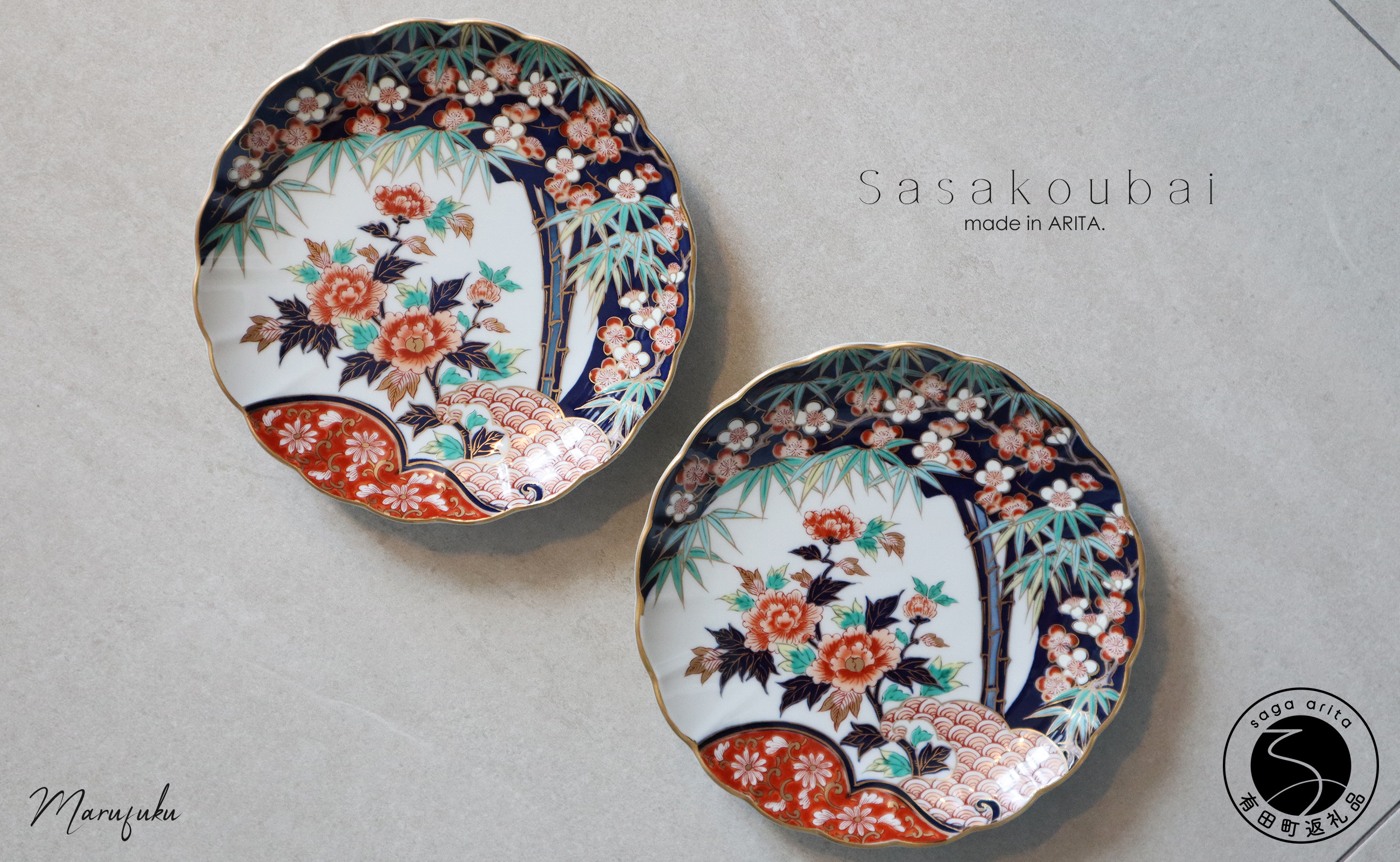 華やかなお正月のシーンにもぴったり! 有田焼 笹紅梅菊型 18cm プレート 2枚セット【まるふく】お正月 はれの日の器 ワンプレート おしゃれ 和食器 取皿 A70-163