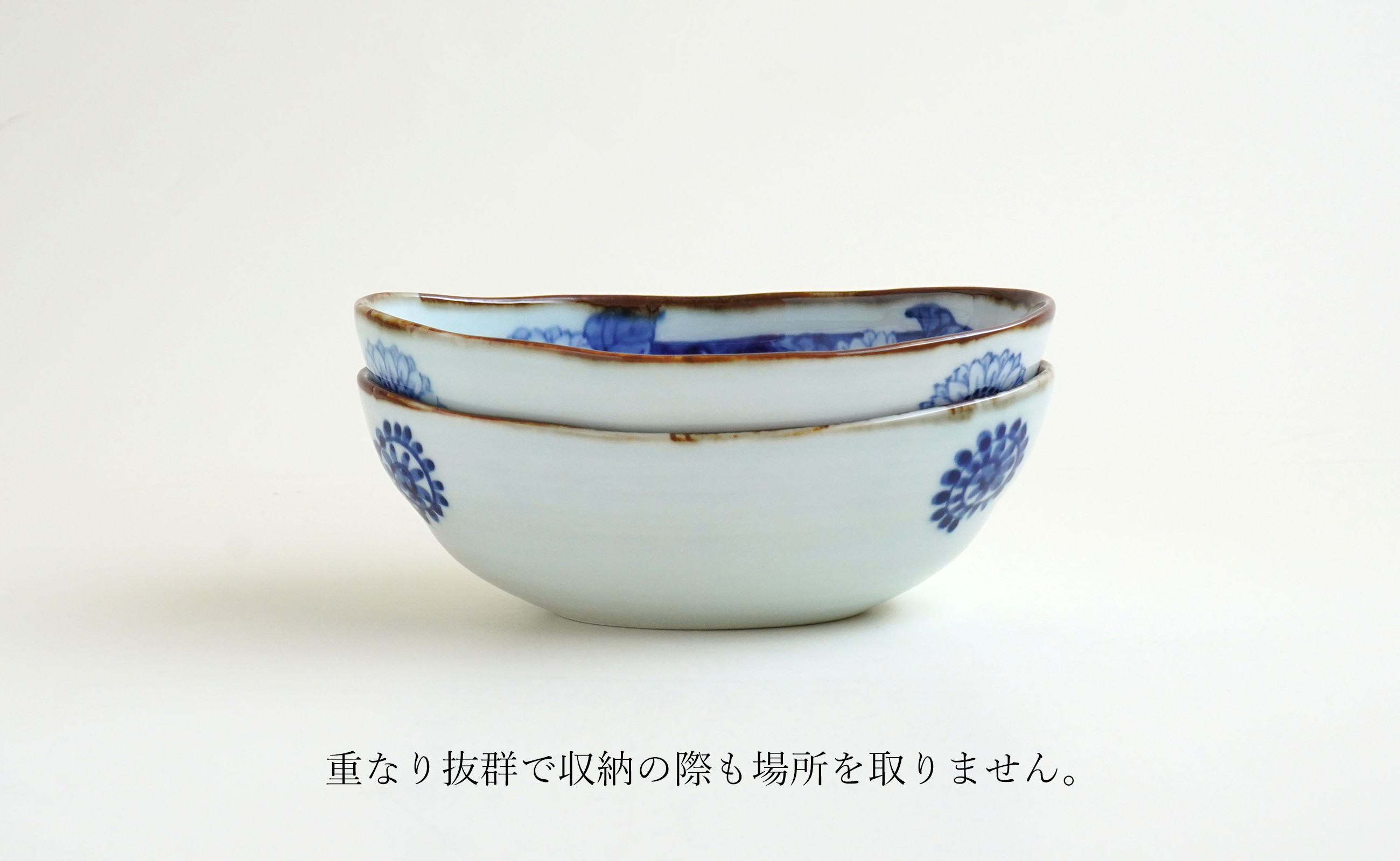 染付の親しみのある和柄の深鉢なのでグラタン・ドリア・焼きカレー、ミニ丼等、どんな料理ともマッチします。
