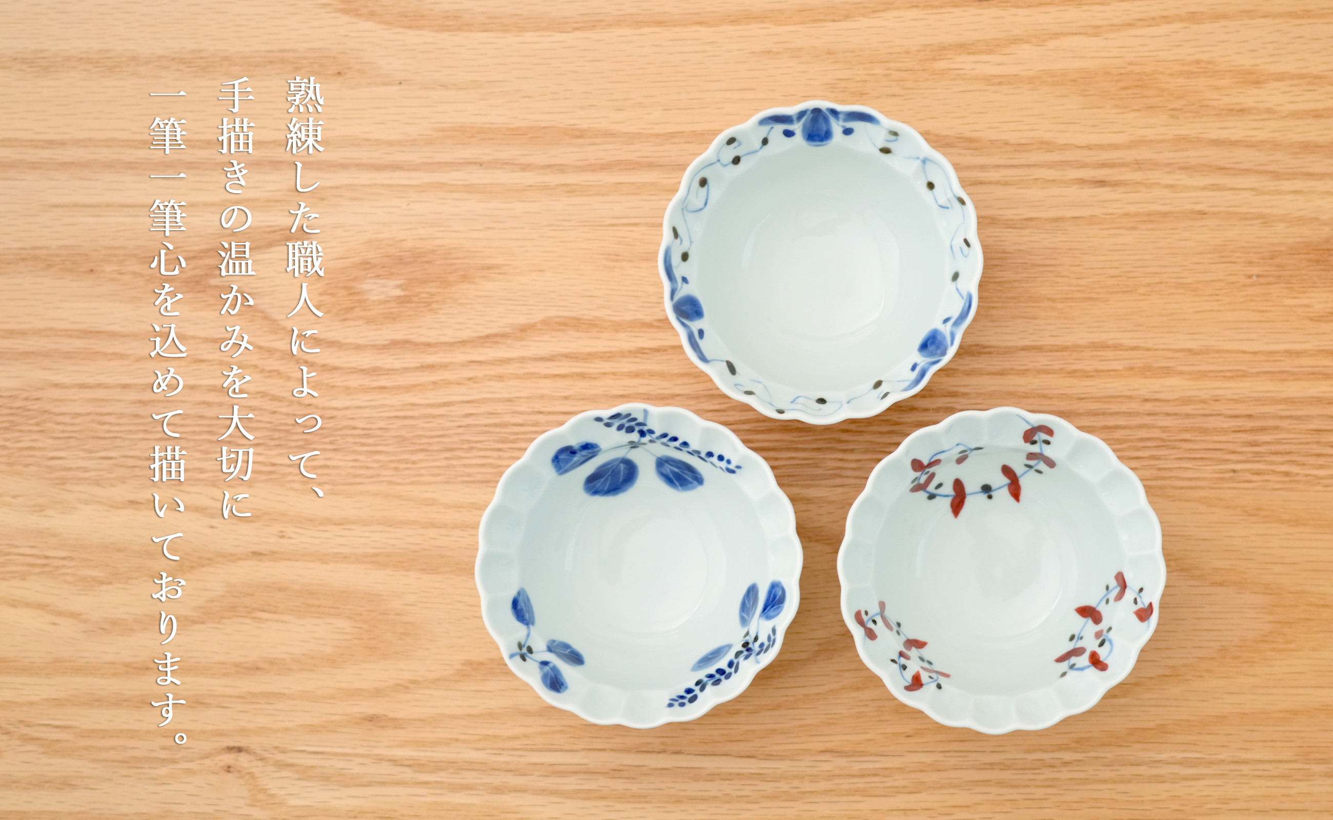 使いやすさにモダンさをプラスした花型小鉢 有田焼 モダンな花型小鉢絵変わり 3点セット【皓洋窯】和食器 食器 器 うつわ 小鉢 ボウル 3柄セット 花形 シンプル 3個セット 手描き 染付 赤絵 25000円 2万5千円 A25-527