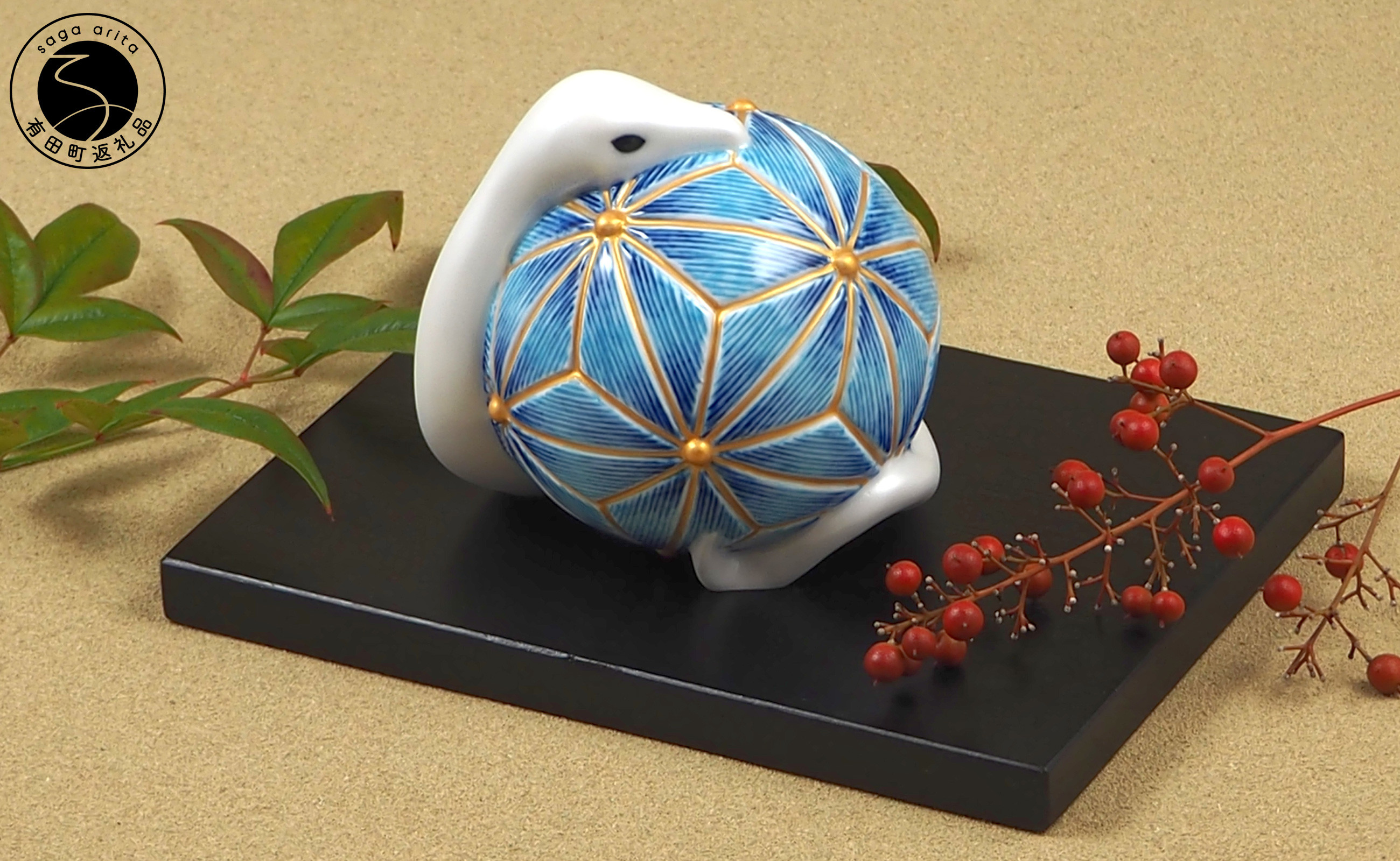 上品な白蛇と鮮やかな手毬の有田焼干支置物 有田焼 干支置物巳(青グラデーション)【隠れ道陶房】巳 干支 置物 へび 手毬 インテリア 和風 光沢 新年 縁起物 A85-25