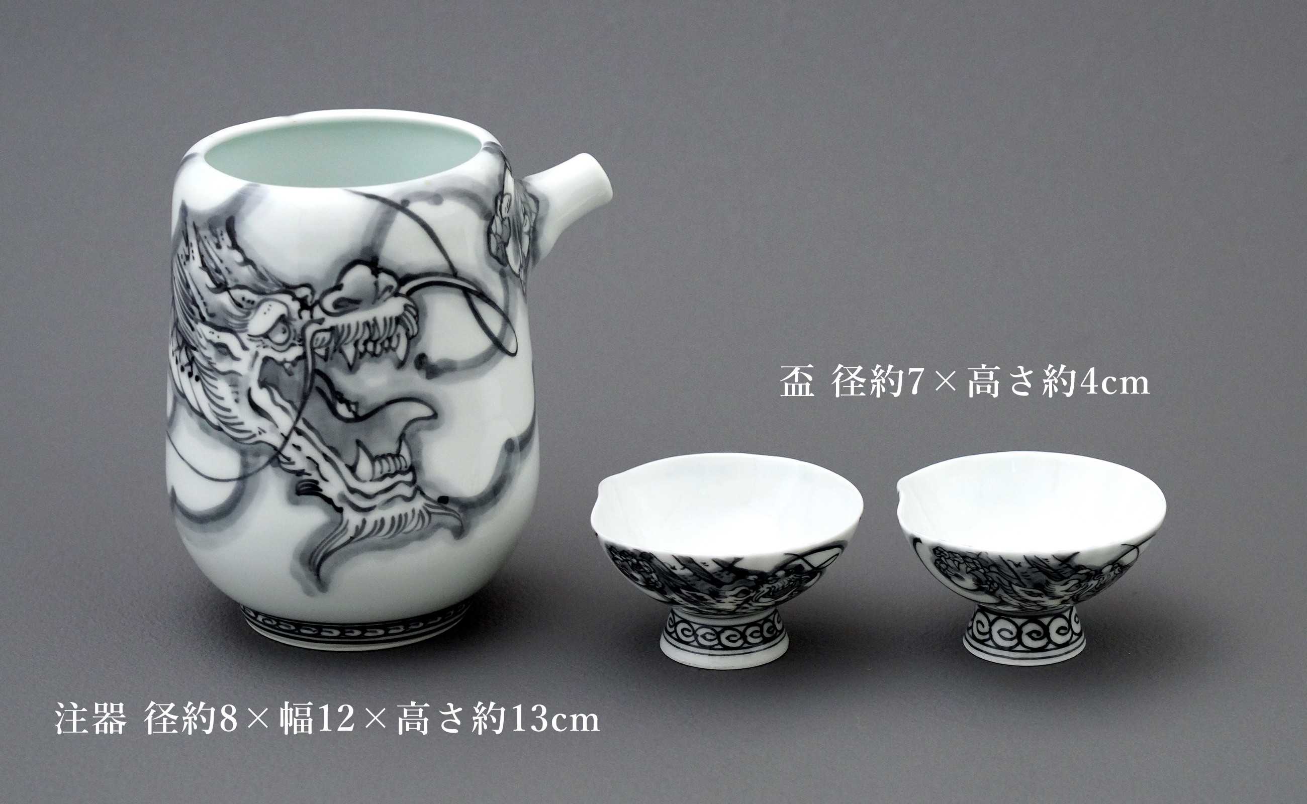 伝統工芸士の技術が光る逸品。神龍を墨呉須で力強く描いた酒器。