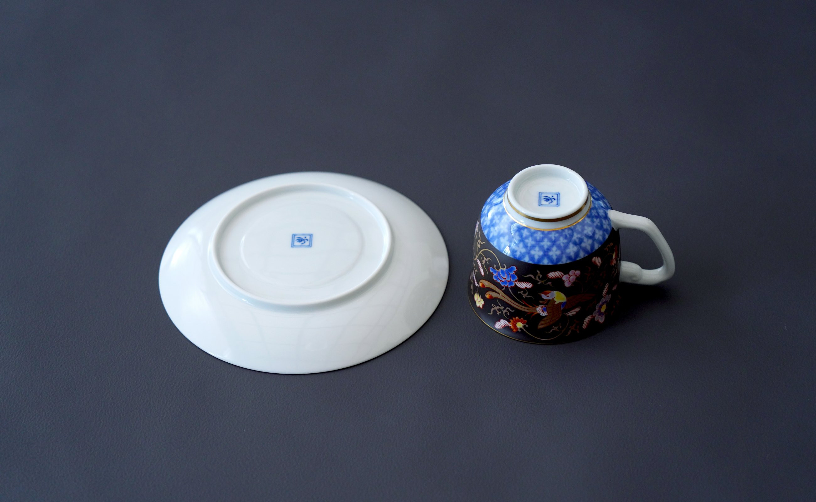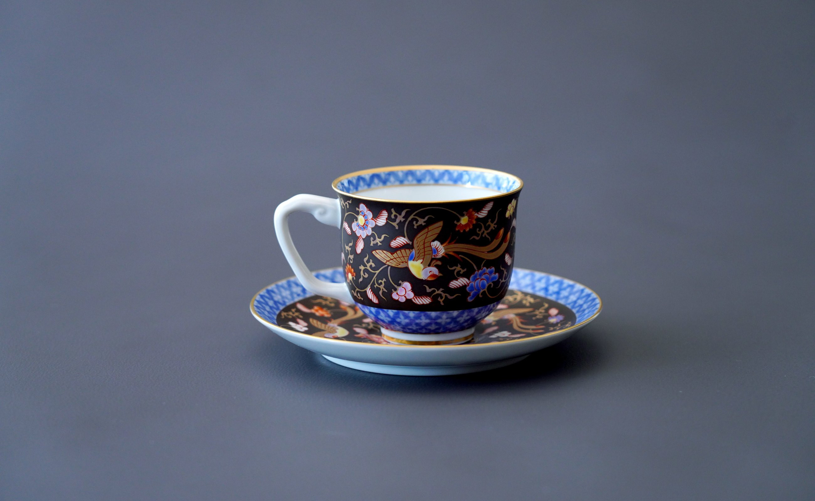 明治期の図柄を復刻した伝統あるデザイン 有田焼 渕地黒絵花鳥紋・コーヒー碗皿【香蘭社】食器 うつわ 器 磁器 豪華 華やか 紅茶 コーヒー おもてなし ティータイム A190-22