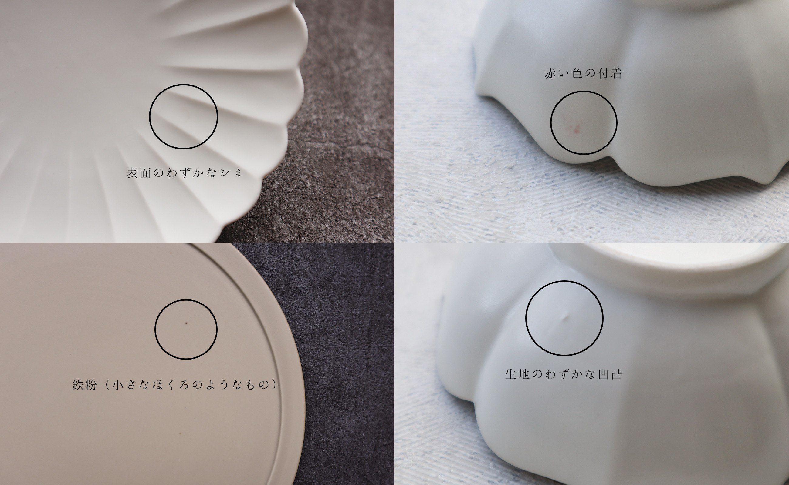 ピンホール、鉄粉、小キズ、絵付けのみだれ、生地の不良、わずかなぐらつき、表面の凹凸、釉薬のかすれやムラ など