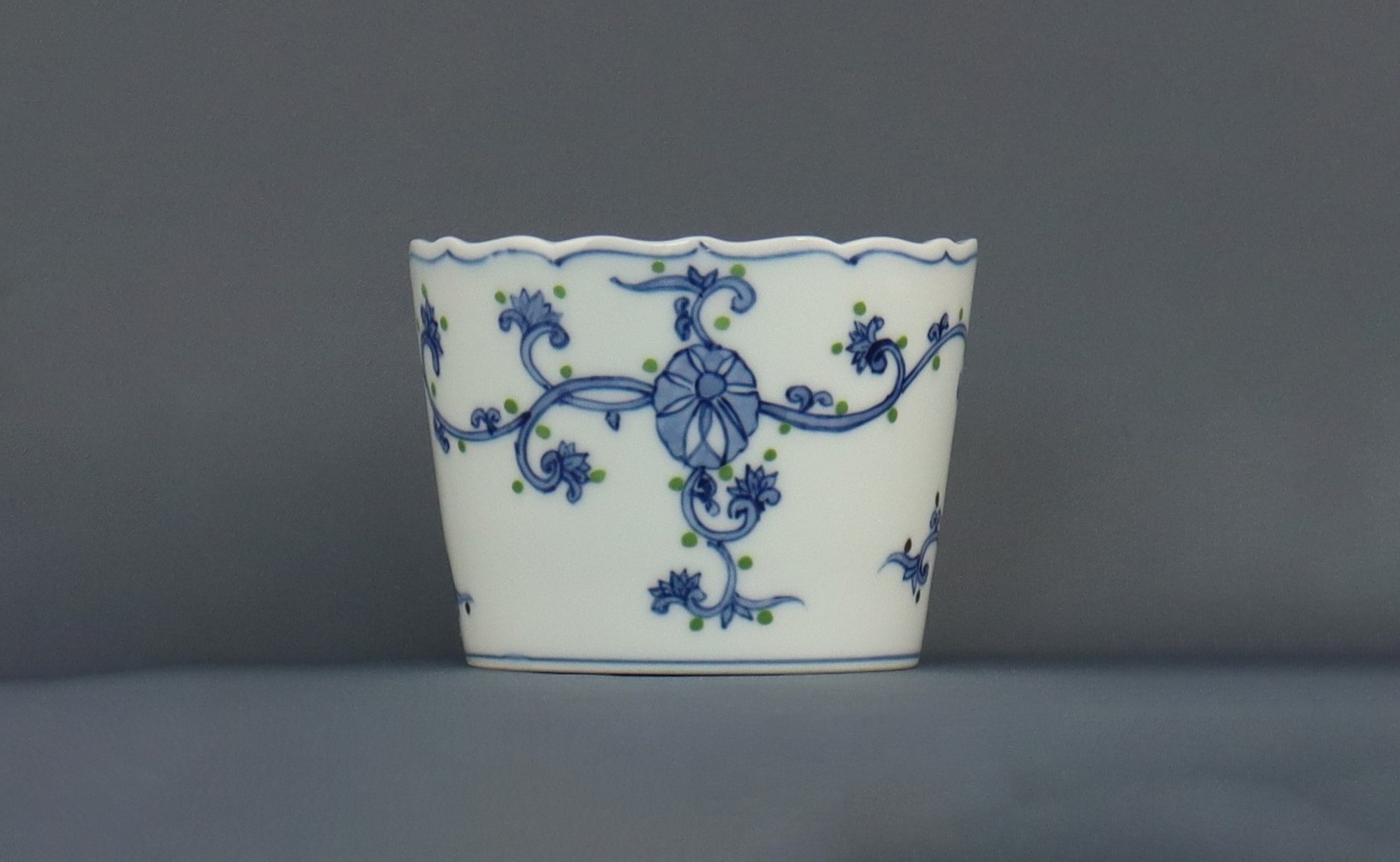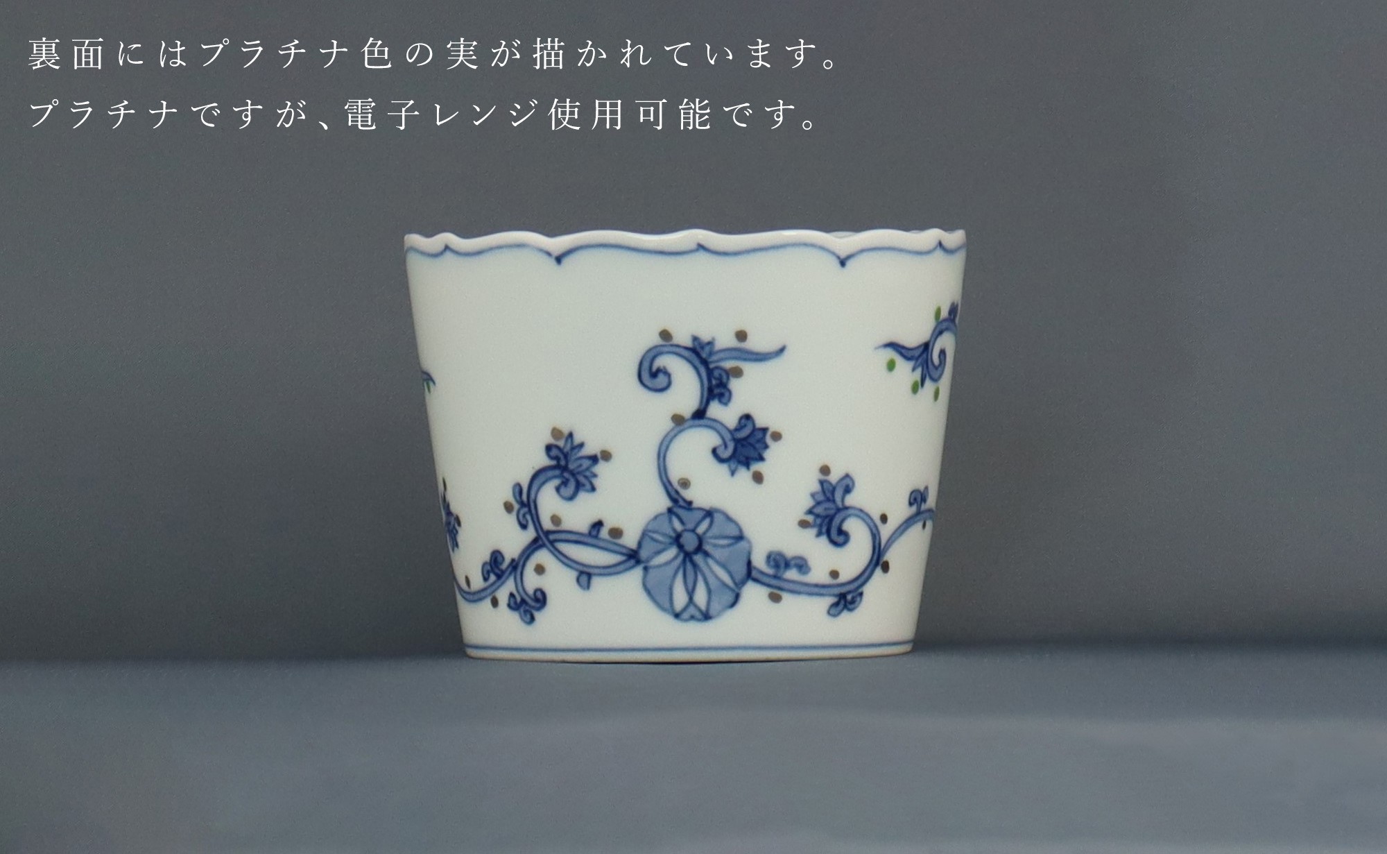 有田ブルーの染付にオモテ面は緑色のつる豆を施し、ウラ面には、プラチナ色のつる豆が実をつけています。