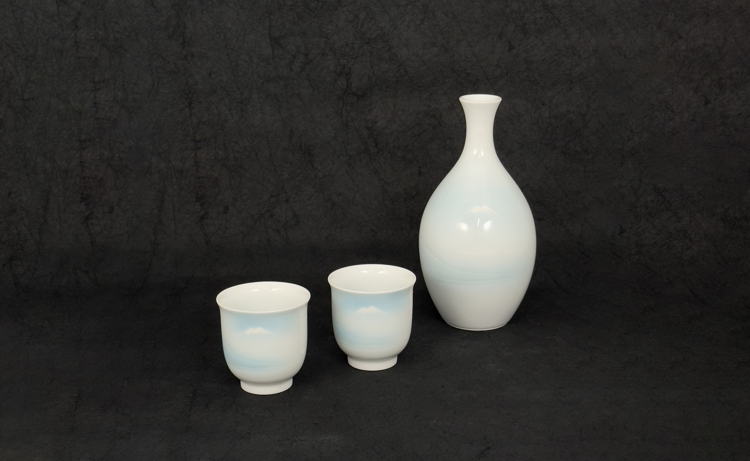 最上の陶土にて、青白釉の富士山文を酒器に表現