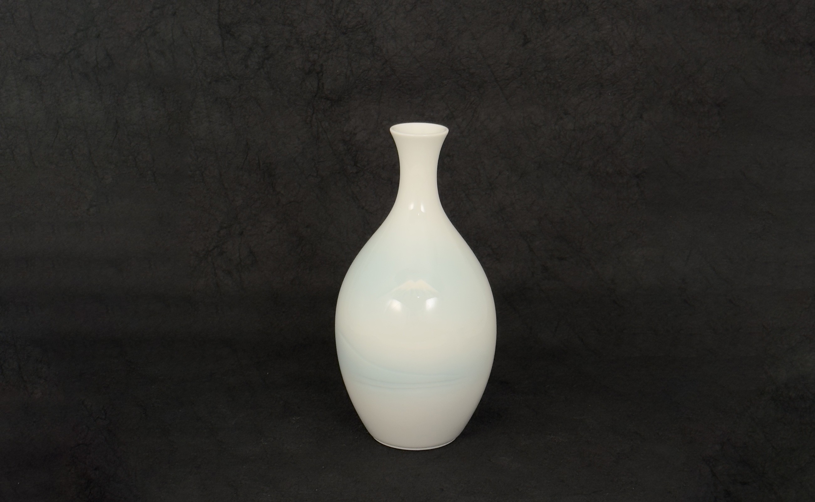 この酒器は、見る者の心を穏やかにするような柔らかな青白磁の釉薬で仕上げられており、器の中央には繊細に浮かび上がる富士山が表現されています。