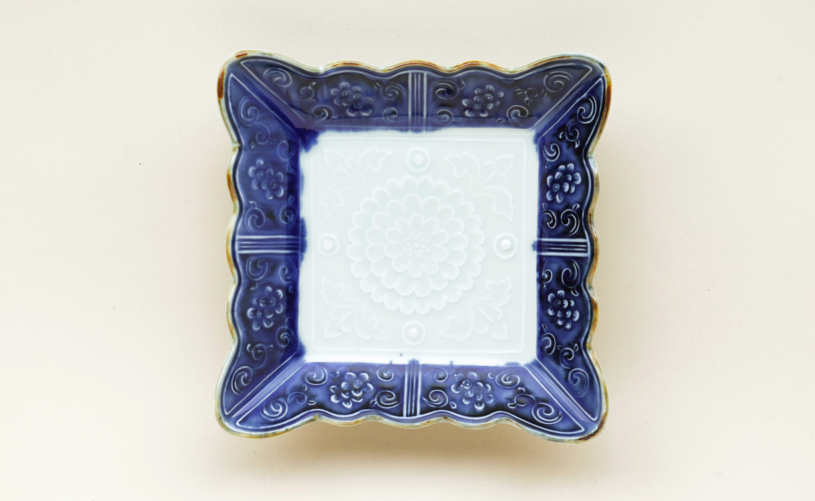 地域の生産者応援の品 額縁のようなお皿に食材を飾って! 【アウトレット・デッドストック 】有田焼 フチサビ 青釉流し 額縁形レリーフ 高台皿 【SPECIAL THANKS】 食器 うつわ 器 訳あり 染付 15000円 A15-321