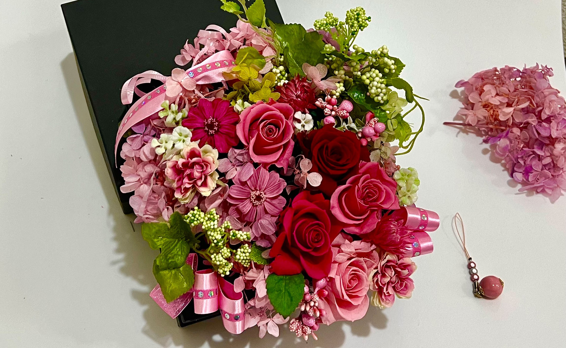 母の日の贈り物は、ピンクの花いっぱいのプリザーブドフラワーで