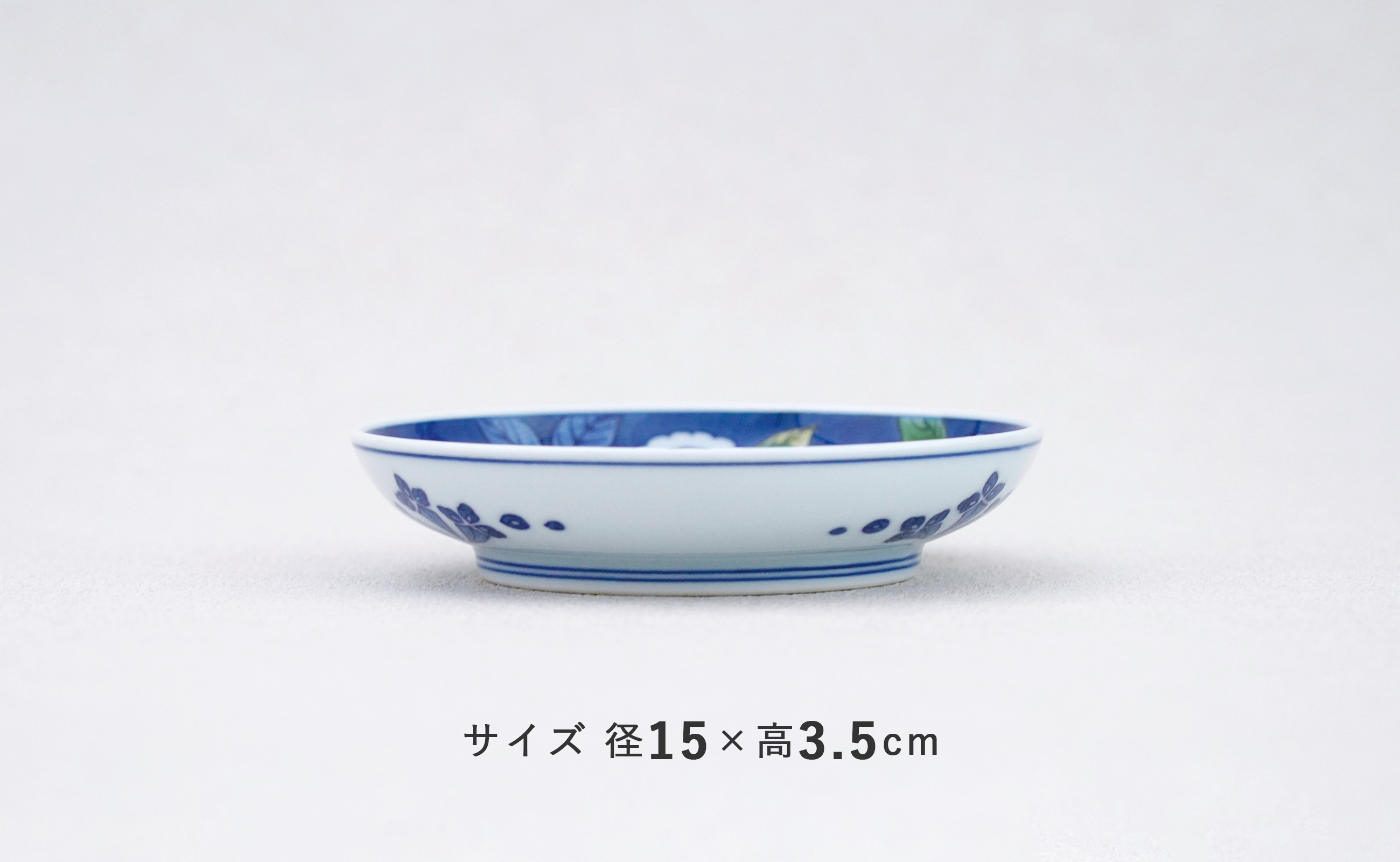 源右衛門窯らしさを凝縮させた銘々皿。染付と上絵の絶妙なバランスが白い花のかわいらしさを際立たせます。サイズ感も程よく、和洋中、さまざまなお料理に彩りを添えてくれます。