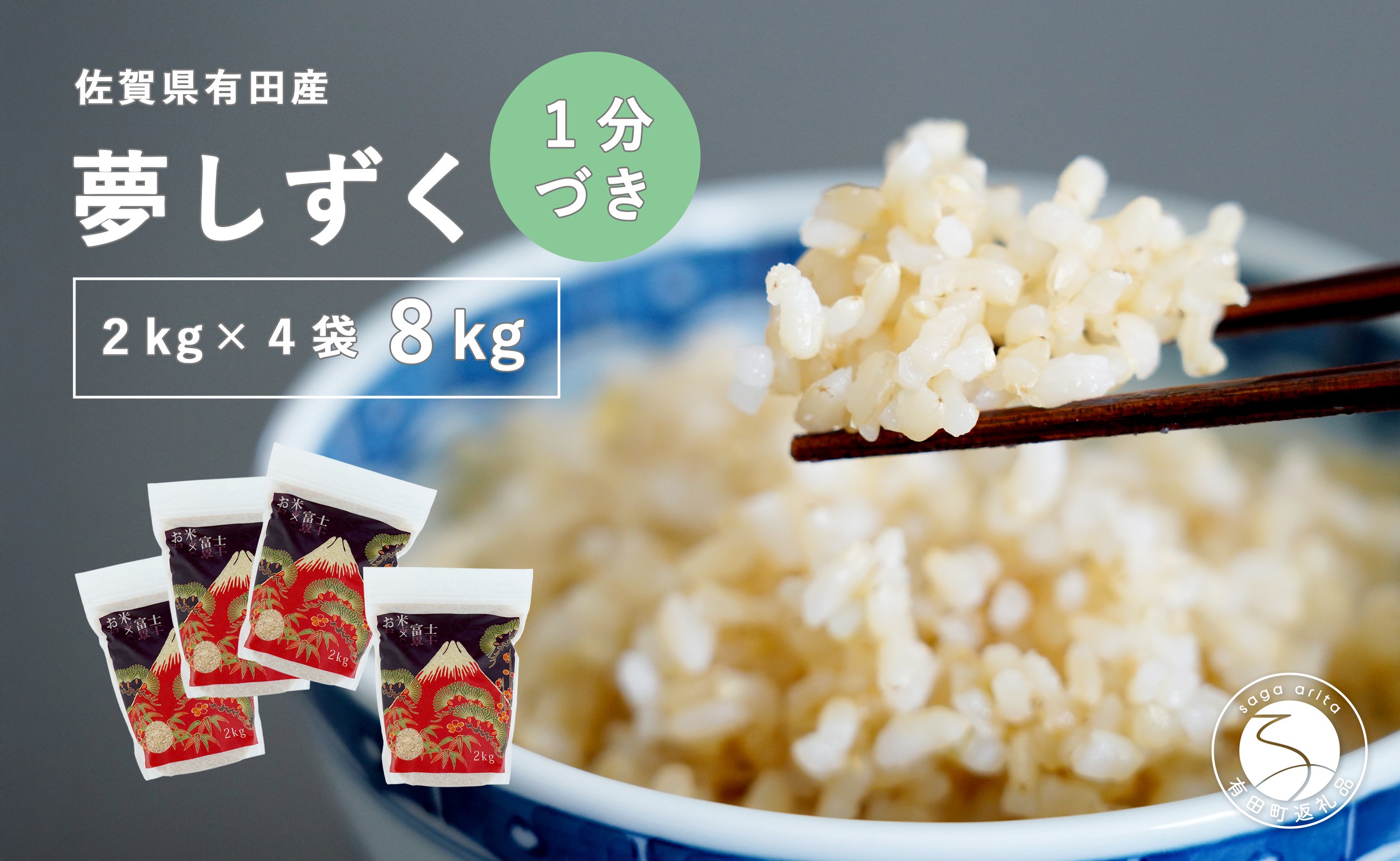 | 容量 | 夢しずく 〈1分づき米〉 2kg×4袋 総量 8kg ※毎年9月頃より新米をお送りします。 |