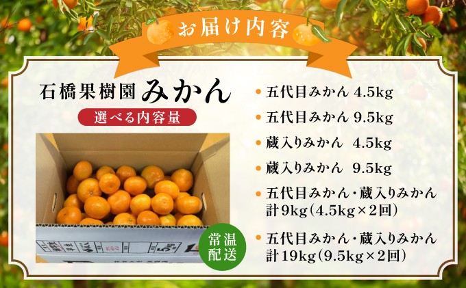 | 容量 | ・五代目みかん4.5kgor9.5kg ・蔵入りみかん4.5kgor9.5kg ・五代目みかん・蔵入りみかん 4.5kg×2回or 9.5kg×2回 |