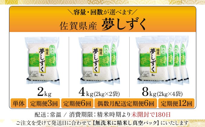 2年連続『特A評価』夢しずくを精米直後に真空パック! 《選べる容量&配送回数》令和7年産【無洗米】夢しずく 2~8kg (真空パック)《特A評価!》| 単品 定期便 偶数月 米 お米 ごはん 弁当 銘柄米 白米 県産米 佐賀県産 国産米 ブランド米 おにぎり 国産 佐賀県 単一原料米 五つ星お米マイスター
