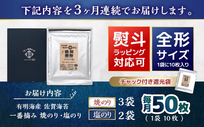 「一番摘み海苔」のおいしさ広がる詰め合わせ! 【3回定期便】佐賀県有明海産 一番摘み海苔セット(焼のり3袋/塩のり2袋 各全形10枚入り)海苔 のり【松尾水産】[IAY023] [IAY023]