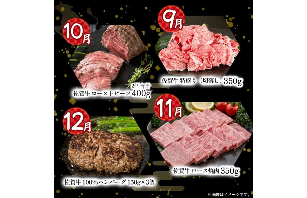 | 容量 | 1月: 佐賀牛 ローストビーフ 400g(2個で) 2月: 佐賀牛 赤身焼肉 350g 3月: 佐賀牛 ロースステーキ 280g(140g×2枚) 4月: 佐賀牛 ウデブロック 350g 5月: 佐賀牛 ヒレステーキ 360g(2枚で) 6月: 佐賀牛 ロースステーキ 280g(140g×2枚) 7月: 佐賀牛 ハンバーグ 150g×3個 8月: 佐賀牛 しゃぶしゃぶすき焼き350g 9月: 佐賀牛 特盛り(切落し)350g 10月: 佐賀牛 ローストビーフ 400g (2個で) 11月: 佐賀牛 ロース焼肉 350g 12月: 佐賀牛 100%ハンバーグ 150g×3個 |