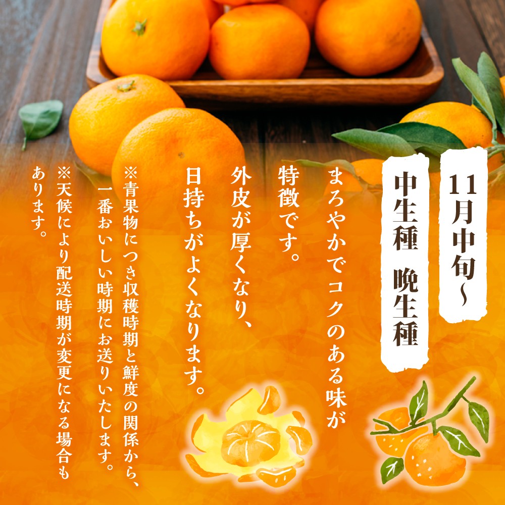 | 容量 | 内容量:黒酢みかん(小玉)5kg(ダンボール込総重量) サイズ:3S(直径約50㎜前後)~2S(直径約50㎜~55㎜) 商品の消費期限:到着日から10日 ◆特徴◆ ◎10月~11月上旬 極早生種、早生種 初秋に収穫される、さっぱりとしてみずみずしい極早生のみかんです。 青さの残る小玉みかんですが、内袋が薄く晩生みかんと違った甘みと酸味の食感をお楽しみいただけます。 外皮が薄く、傷みやすいので冷蔵庫などで保存してください。 ◎11月中旬~ 中生種、晩生種 まろやかでコクのある味が特徴です。外皮が厚くなり、日持ちがよくなります。 ※青果物につき、収穫時期と鮮度の関係から、一番おいしい時期にお送りいたしますので、配達日時をご指定されました場合でも、到着が前後することがございます。予めご了承ください。 ※天候により配送時期が変更になる場合もあります。 ※12月から1月にかけましては、混雑が予想されます。配送希望日に添えない場合がございますので予めご了承ください。 |