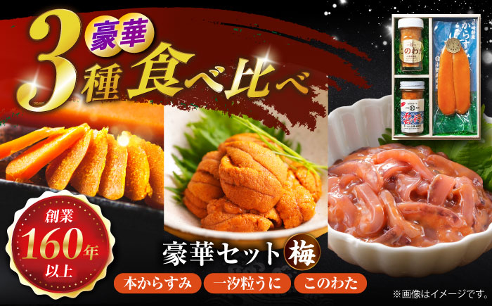 日本三代珍味のからすみと一汐粒うに、このわたをセットにしました。贈答にどうぞ。 本からすみ・一汐粒うに・このわたセット(梅) 長崎県/株式会社小野原本店 [42AACM011] からすみ カラスミ 珍味 国産 珍味 酒の肴 つまみ 贈答 お歳暮 お中元 お取り寄せ 熨斗 のし ギフト 父の日 お礼 プレゼント ボッタルガ
